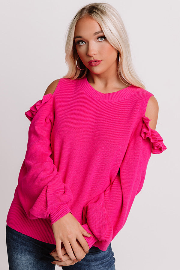 This darling pink sweater is "sweet as sugar" with its ultra soft lightweight tight knit material with subtle ribbed texturing, a high rounded neckline, long loose bubble sleeves with fitted cuffs and cold shoulder cutouts with oversized ruffle trim detailing, and a relaxed silhouette that falls into a straight hemline! Measurements