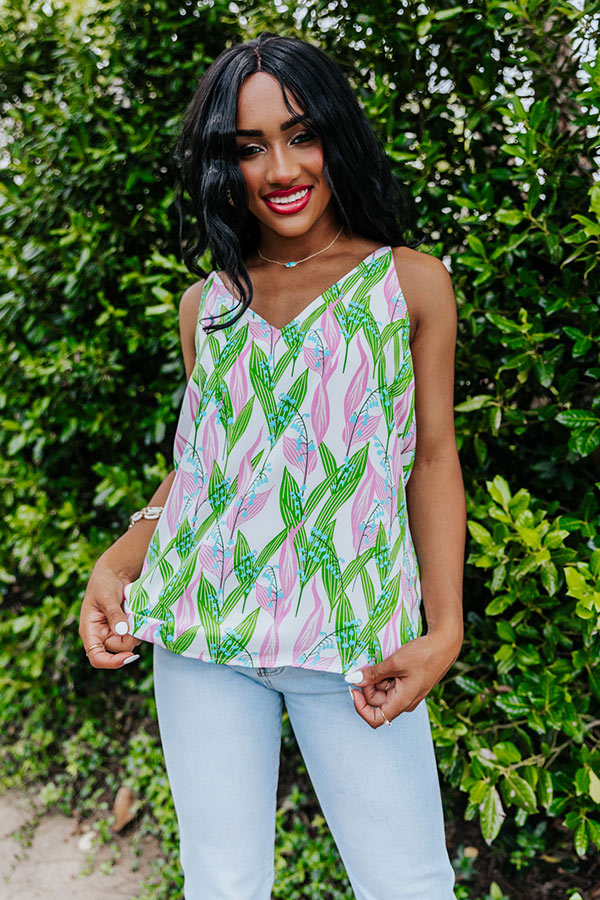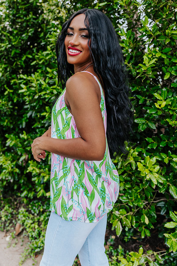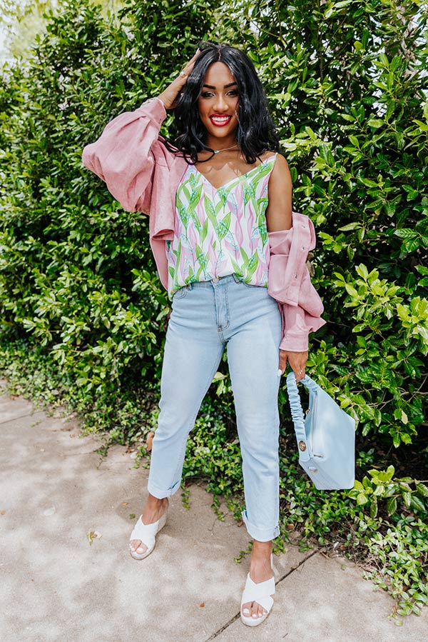 You are sure to get some sweet attention when you wear this adorable shift tank featuring lightweight breezy material patterned with a pink and green tropical leaf print, a v-cut neckline and upper back with spaghetti straps, and a relaxed silhouette that falls into a straight hemline!
