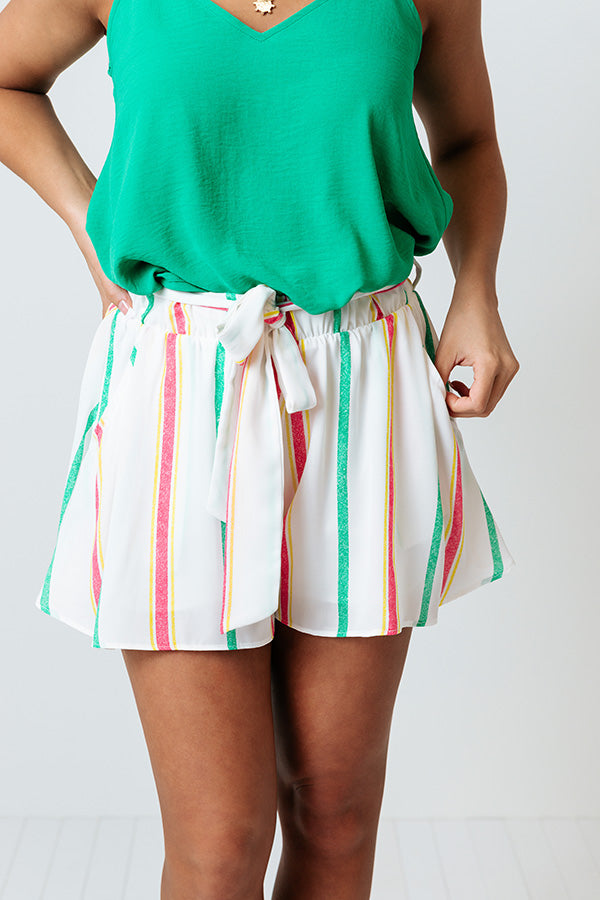 You are sure to get all the attention when you wear these sweet white shorts featuring lightweight breezy material patterned with vertical green, hot pink, and yellow accent stripes, a smocked waistline with belt loops and a tie belt, hidden side pockets, and a shift silhouette that ends in straight upper-thigh length hemlines! Measurements