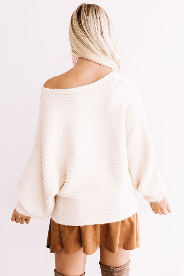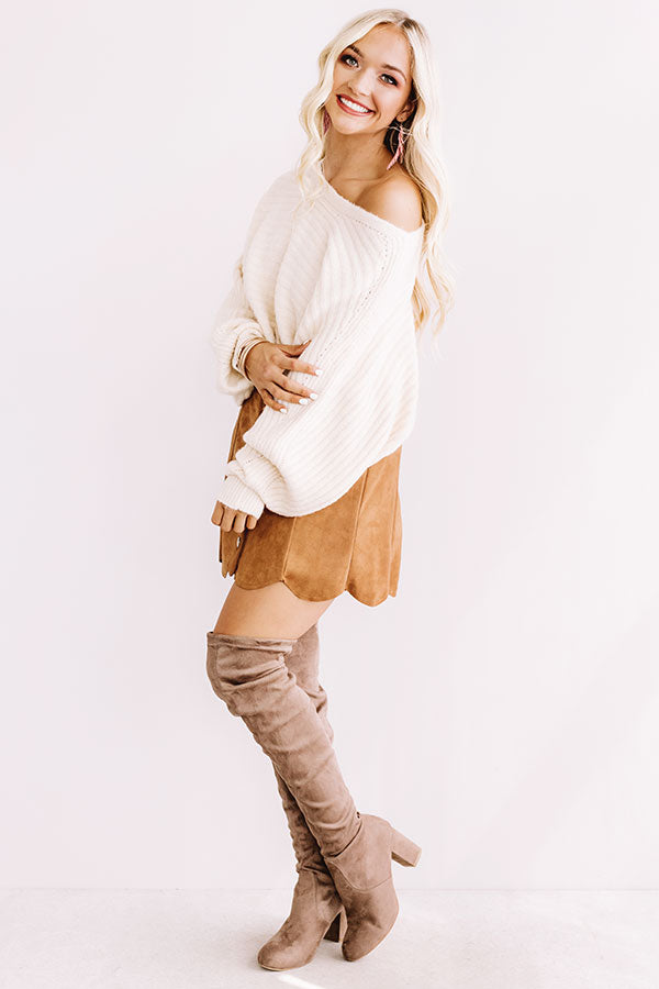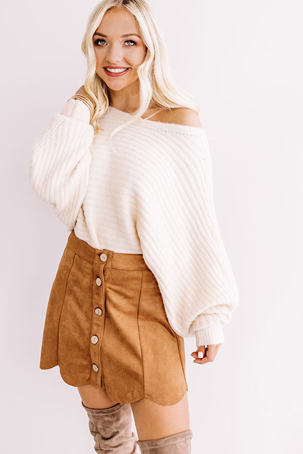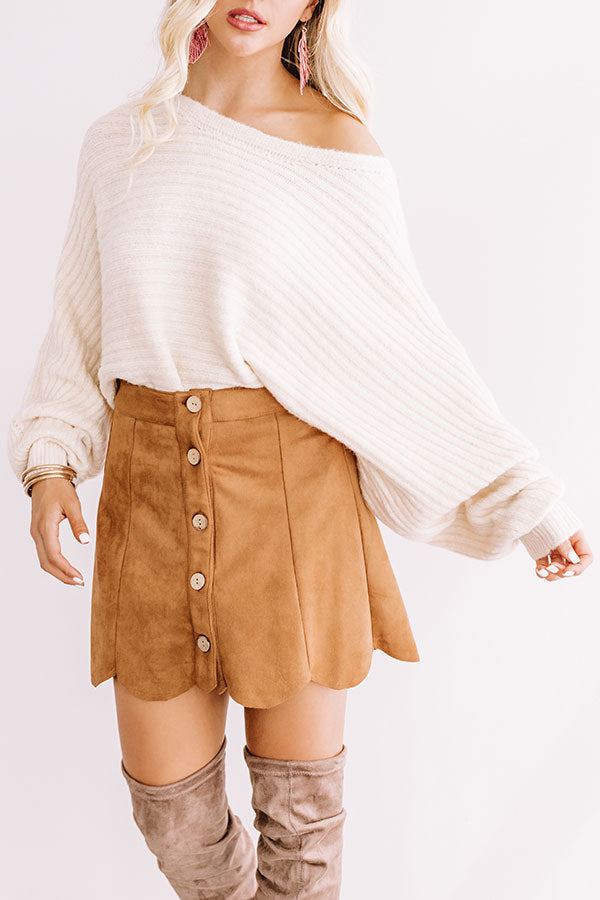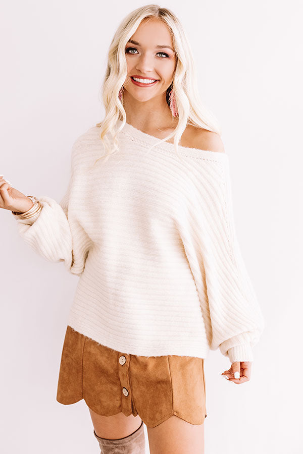 If you are looking for some "sweet cuddles," then look no further than this ultra cozy ivory colored shift sweater featuring stretchy loose knit material with large ribbed texturing, a high rounded neckline that can be worn off one shoulder, long oversized batwing sleeves with wide fitted cuffs, and an ultra relaxed bodice that falls into a straight hemline! This unique cold weather essential can be styled a variety of ways, like tucked into a camel faux suede skirt with a plaid scarf and a neutral over the knee boot, or with some distressed ankle skinnies, "The Pryor Faux Leather Peep Toe Bootie in Blush," and our "All Caught Up Headband in Blush!" Measurements