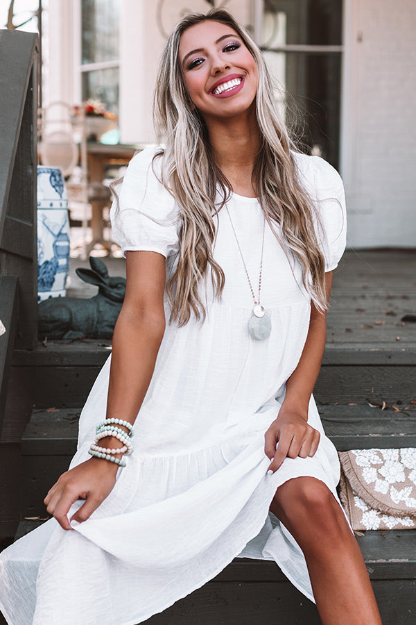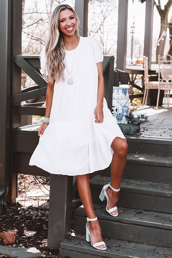 Look chic anywhere you go in our gorgeous little white "Sweet Dawn" midi dress featuring lightweight breezy material, a scooped neckline, short bubble sleeves with fitted elastic banded cuffs, a keyhole accented upper back with a button closure, accent side pockets, and an ultra relaxed tiered silhouette that falls into a rounded mid-calf length hemline! You can style this elegant piece a variety of ways, like with a simple heel and embellished clutch, or you can wear it layered under a denim jacket with "The Allen Wedge in Coral" and our matching "Start It Up Hair Scarf!" Measurements