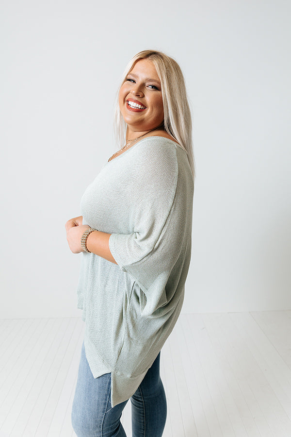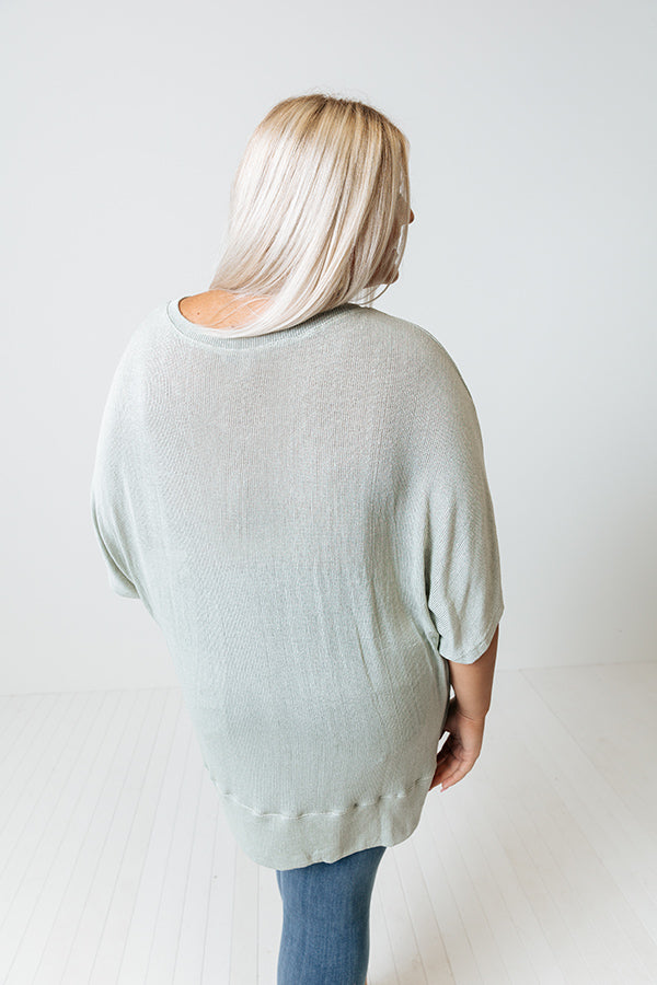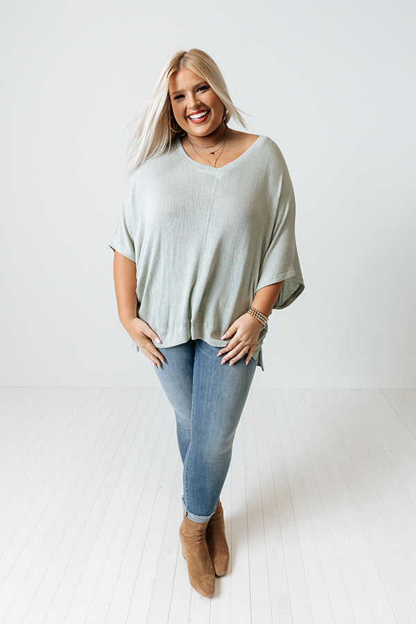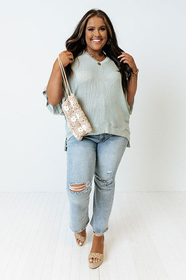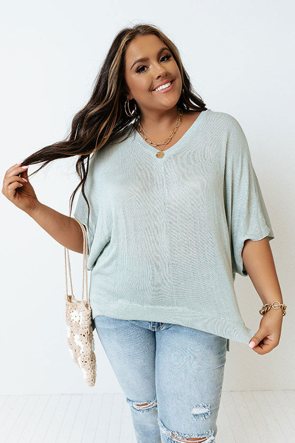 Get ready effortlessly with our versatile plus size mint colored 'Sweet Daybreak' shift top featuring soft tight knit material, a v-cut neckline, short sleeves, and a draped silhouette that falls into a straight high/low hemline with accent side slits!