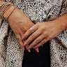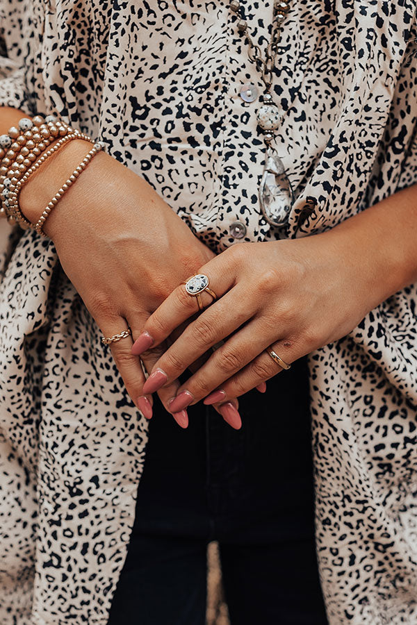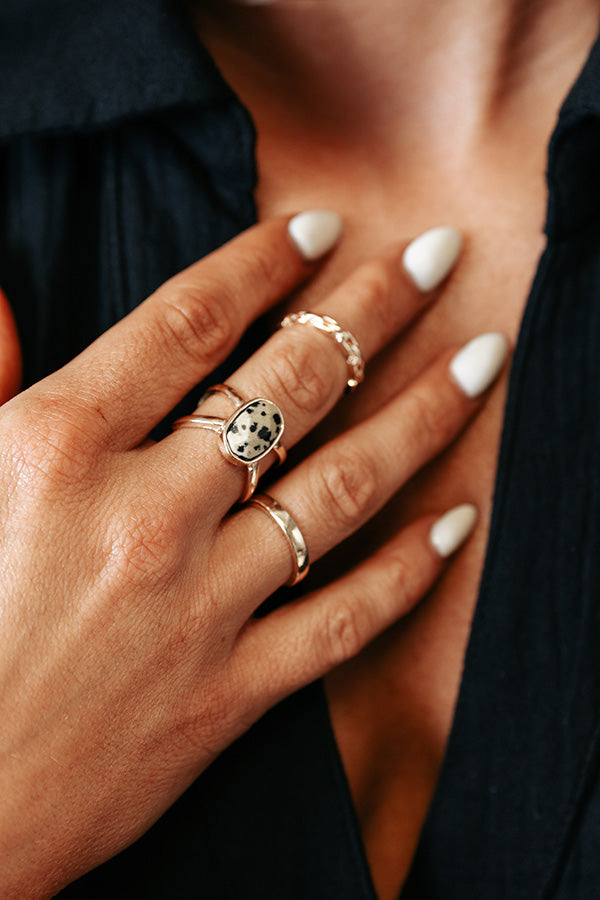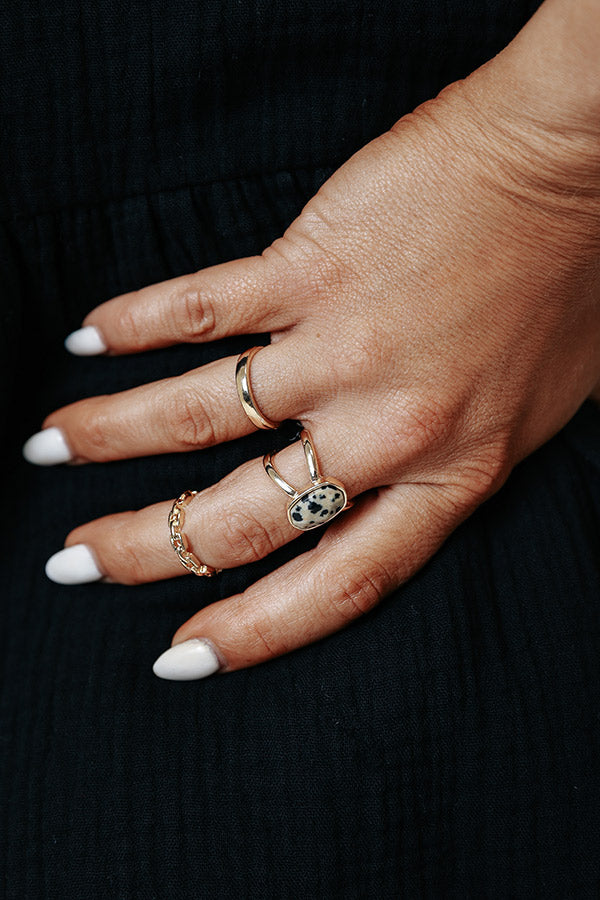 We have no doubt you will want to accessorize with this sweet ring set daily with its 3 pieces: a beige oval stone, a solid gold band, and a gold chain band! Ring Size: 5-7