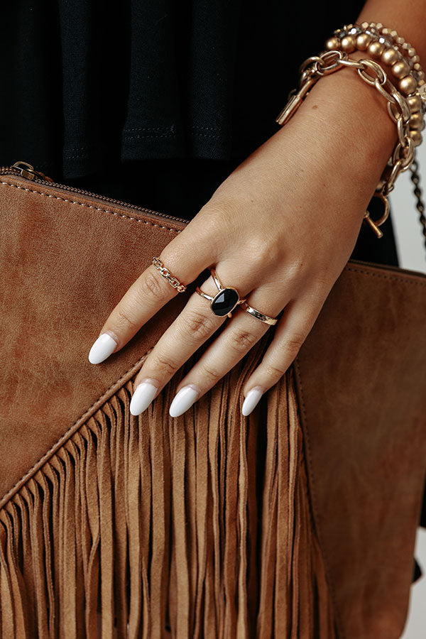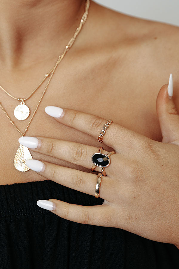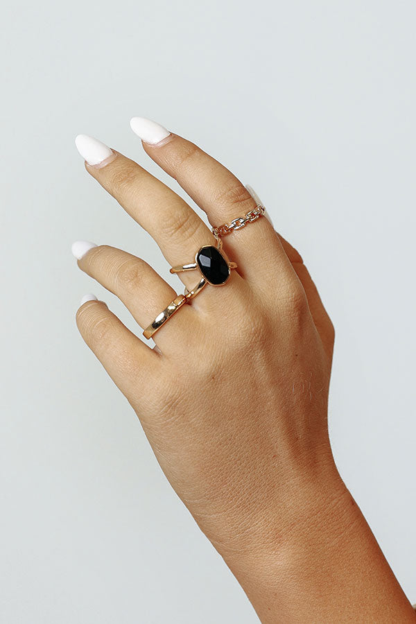 We have no doubt you will want to accessorize with this sweet ring set daily with its 3 pieces: a black oval stone, a solid gold band, and a gold chain band!