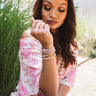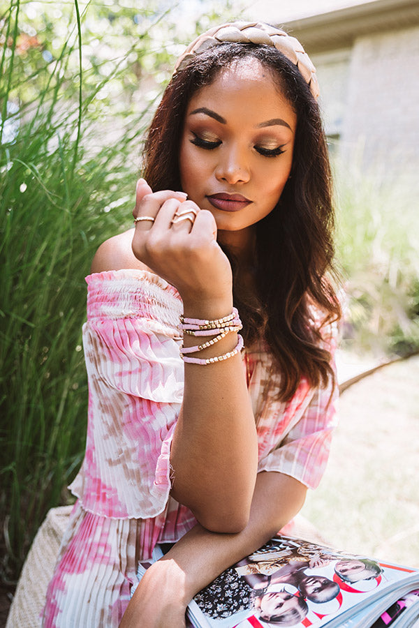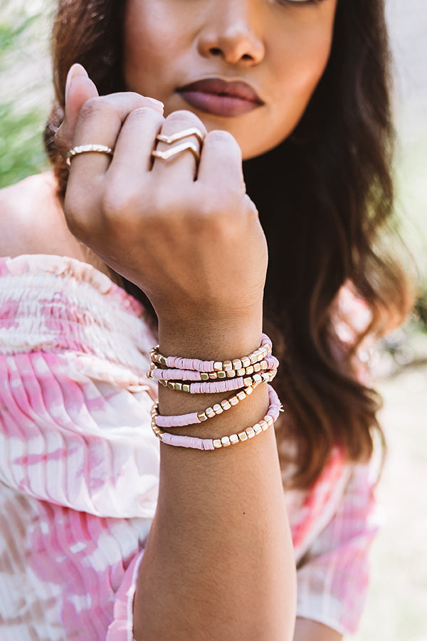 Add a glamorous touch to any look with our adorable stretchy "Sweet Friendship Bracelet Set" featuring five pieces adorned with blush and gold beaded accents!