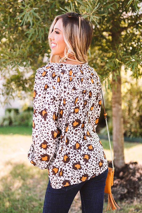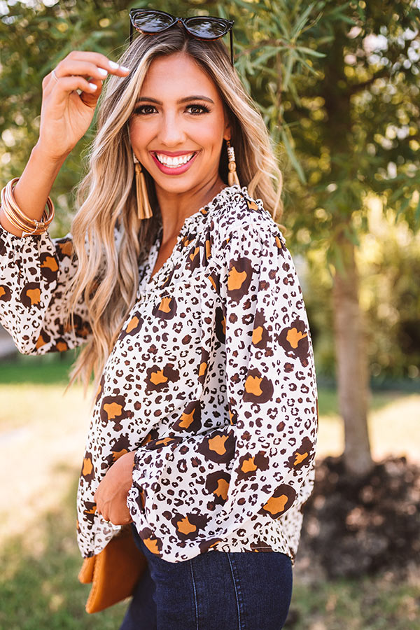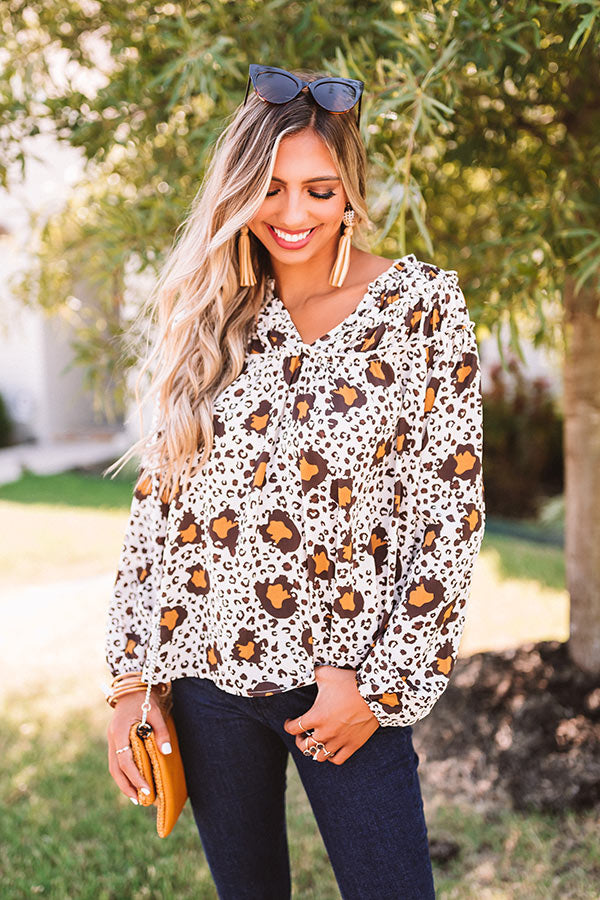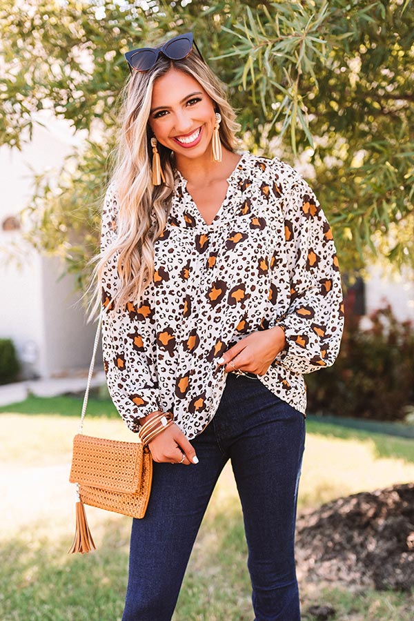 Have a wild fall in this sweet cream colored shift top featuring lightweight breezy material patterned with a bold black, white, and golden hued leopard print, a v-cut neckline with ruffled seams across the bodice, long bubble sleeves with fitted cuffs, and a relaxed silhouette that falls into a rounded hemline! We have styled this stunning piece with some dark wash flares, sunnies, and a matching faux leather crossbody, but you can also wear it with some distressed black skinnies and "The Portia Faux Leather Peep Toe Booties in Camel!" Measurements