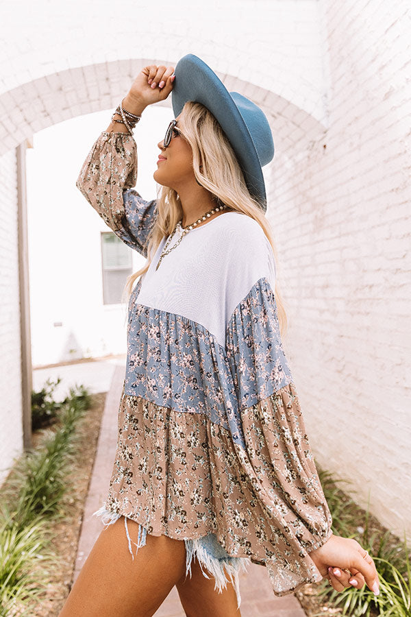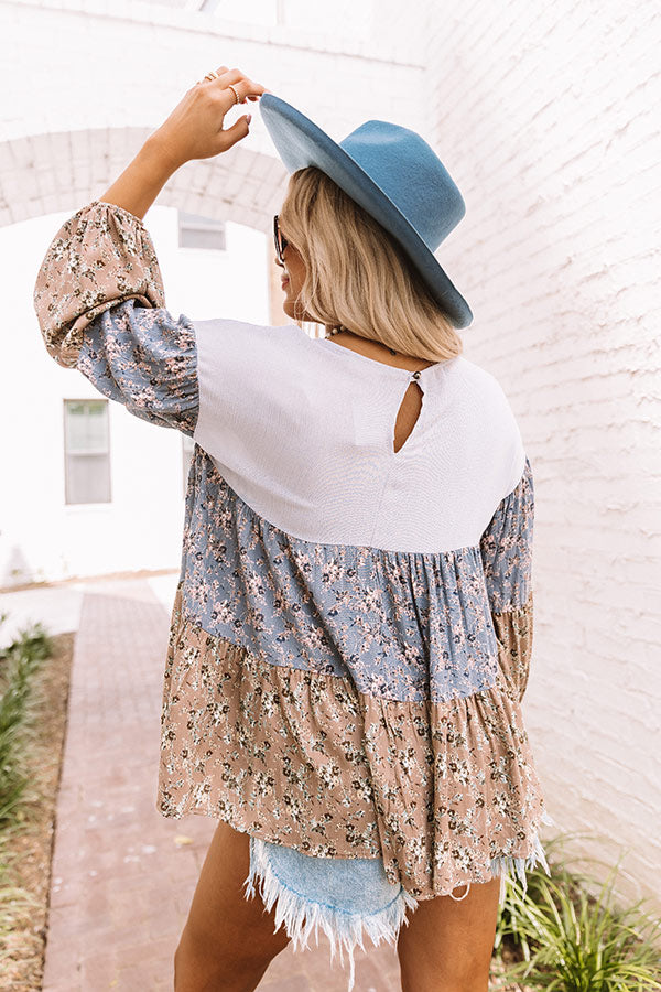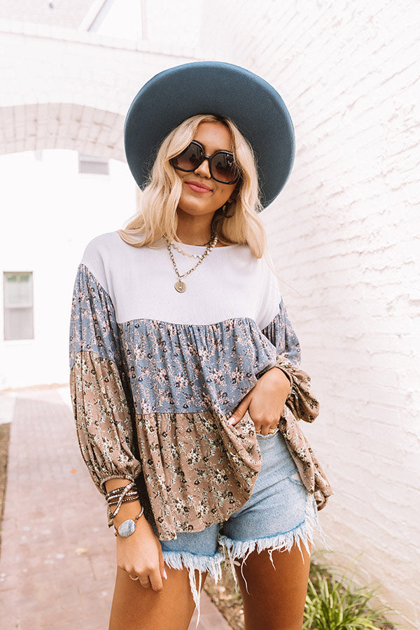 Twirl into the final days of summer with our adorable 'Sweet Intentions' shift top featuring lightweight flowy material, a blue and natural hued color block panel patterned with a small floral print, a grayish blue bodice with a rounded neckline, loose 3/4-length bubble sleeves, and a relaxed tiered silhouette that falls into a rounded hemline! Measurements