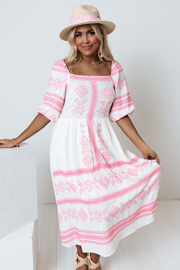You will look so sweet in this darling white dress featuring lightweight flowy material with intricate pink embroidered detailing throughout, a square neckline, short puff sleeves, a form fitting bodice with a smocked back, and a relaxed skirt silhouette that falls into a straight mid-calf length hemline! Measurements