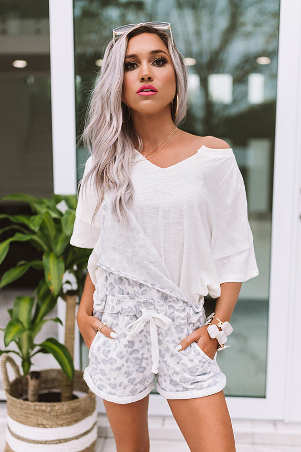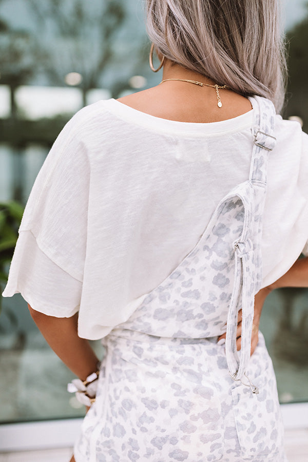 Keep it simple in our basic ivory colored "Sweet Meadow Shift Top" featuring soft lightweight material, a high rounded neckline with a v-cut accent notch that can be worn off one side, short loose sleeves, exposed accent seams, and a relaxed silhouette that falls into a straight cropped hemline! We have styled this casual piece with some leopard overalls and sunnies, but you can also wear it layered under a cropped jean jacket with some distressed black skinnies, "The Allen Wedge in Snake Print," and our "Neutral Territory Snake Print Tote in Grey!" Measurements