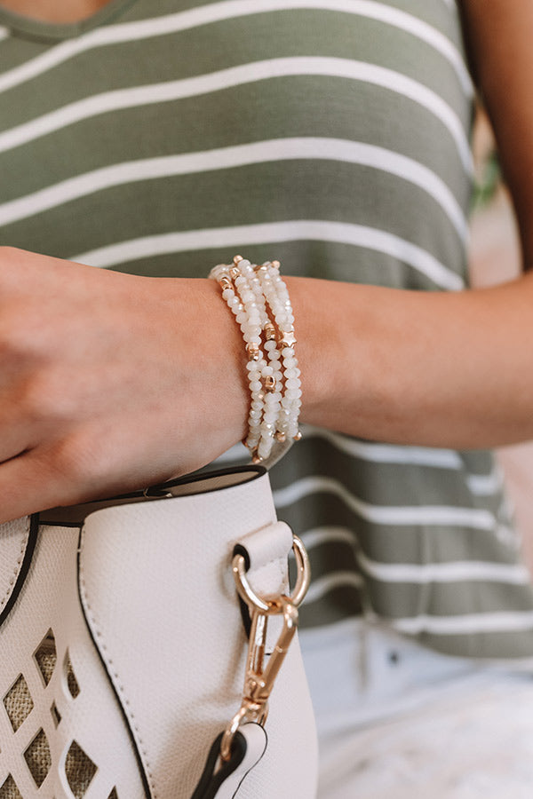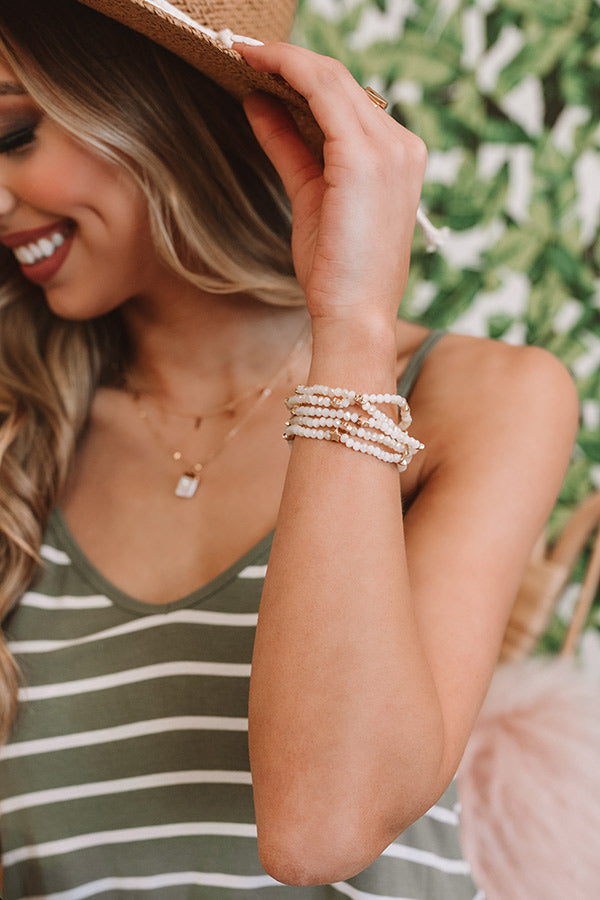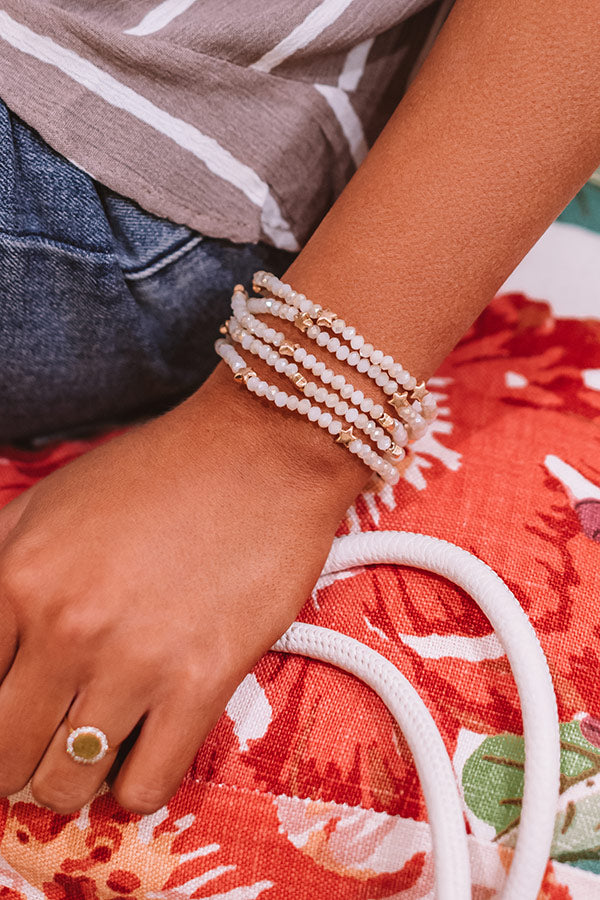 Leave a little shine wherever you go by accessorizing with our dainty "Sweet Nothings Bracelet Set" featuring five white beaded piece with gold star charms and an elastic fit!