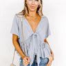 We have no doubt this flirty airy blue top will look so sweet on you with its lightweight material, a v-cut neckline with a front tie detail, short sleeves, and a cute peplum silhouette that ends in an uneven hemline! on products