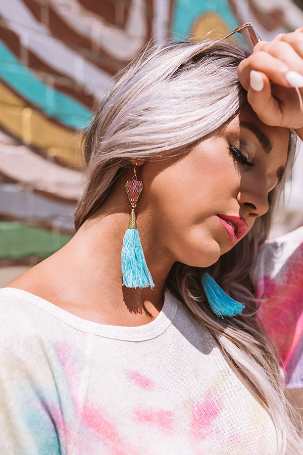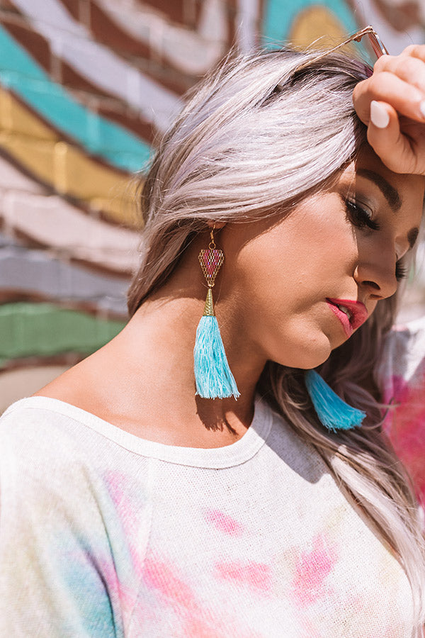 You are sure to turn heads when you accessorize with our adorable "Sweet On Summer" statement earrings featuring dangling gold cutout triangles and sky blue tassels!