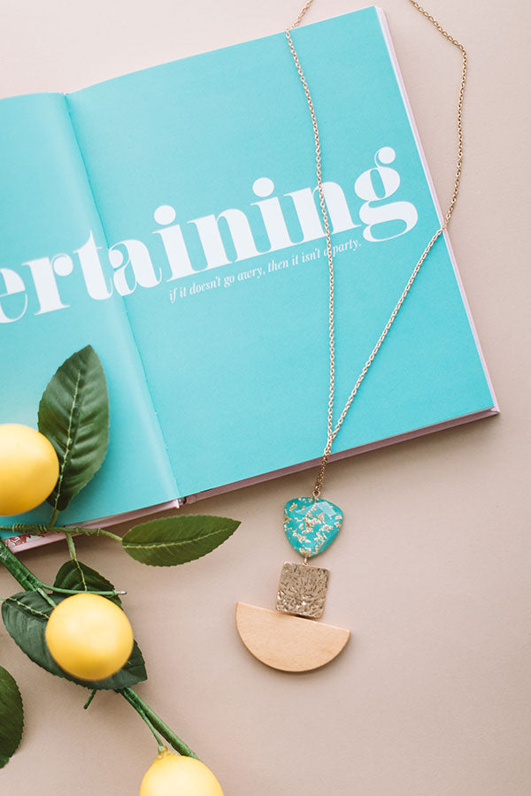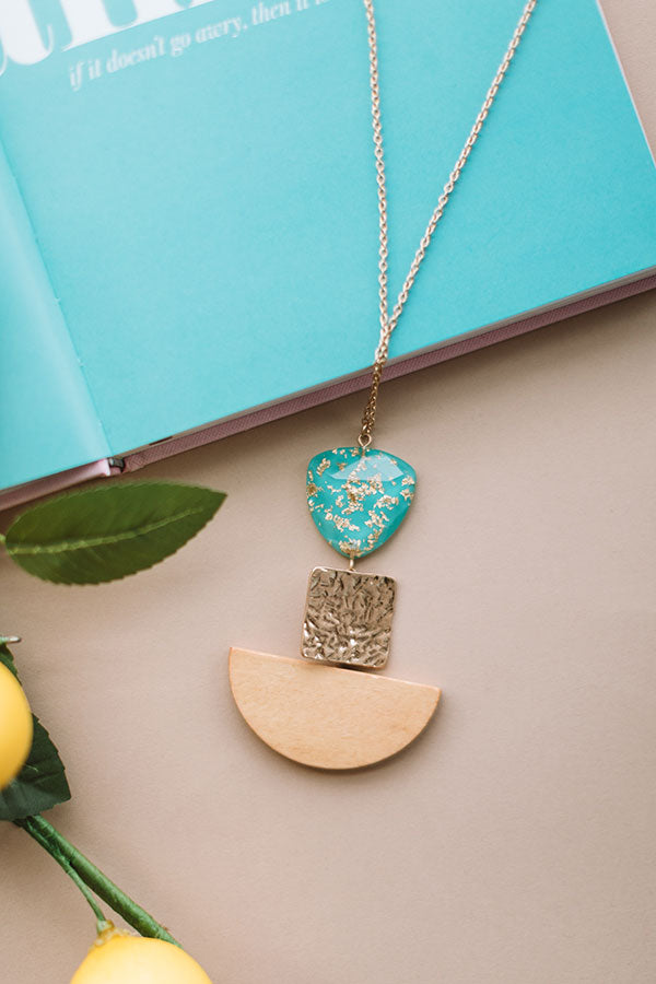 This sweet necklace looks like it came straight from paradise with its long length, gold flecked turquoise pendant, textured gold square, and half circle wooden piece!