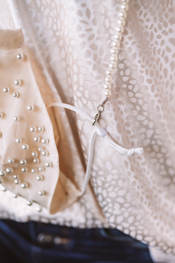 Wear your mask in style by accessorizing with this sweet mask holder featuring a long pearl chain with two clips on the end!