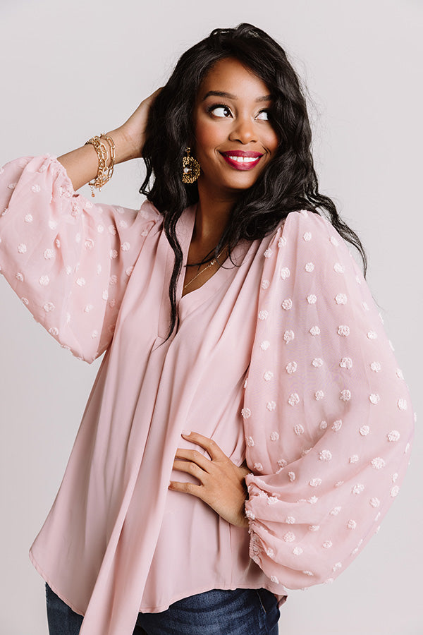 Wear clothes that matter, like our elegant light pink "Sweet Poem Shift Top" featuring lightweight breezy material, a v-cut neckline, long oversized semi-sheer bubble sleeves with fitted elastic band cuffs and patterned with textured polka dots, and a relaxed silhouette that falls into a rounded hemline! Measurements