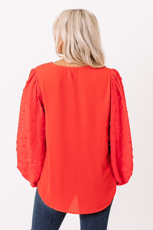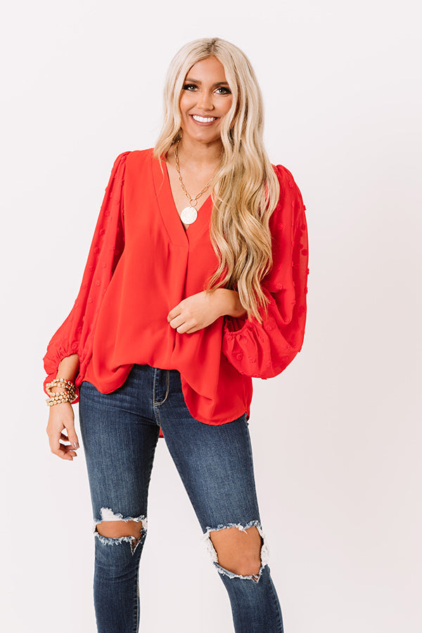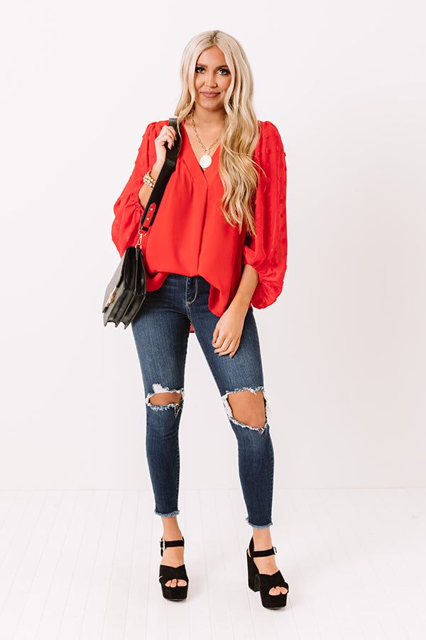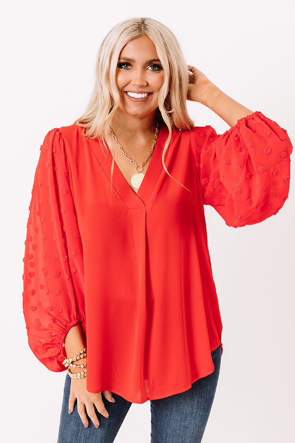 Wear clothes that matter, like our elegant red "Sweet Poem Shift Top" featuring lightweight breezy material, a v-cut neckline, long oversized semi-sheer bubble sleeves with fitted elastic band cuffs and patterned with textured polka dots, and a relaxed silhouette that falls into a rounded hemline!