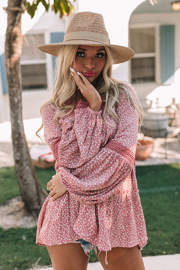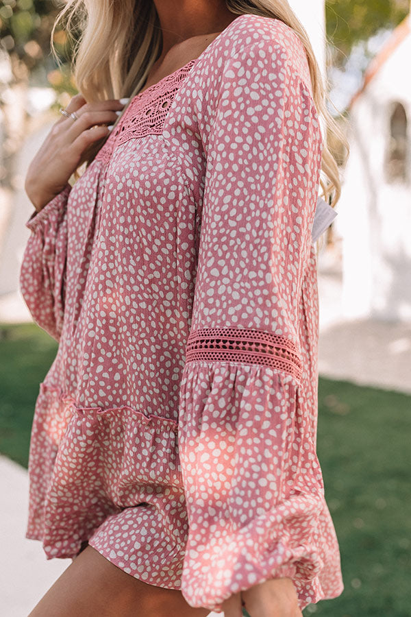 You are sure to have heart eyes for our charming blush colored 'Sweet Poetry Shift Top' featuring lightweight flowy material patterned with a small white spotted print, a scooped neckline with intricate crochet detailing, long loose sleeves with elastic band cuffs, a cutout open back with a button closure, and an ultra relaxed silhouette that falls into a rounded hemline! Measurements