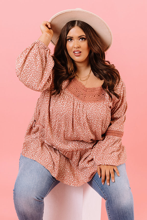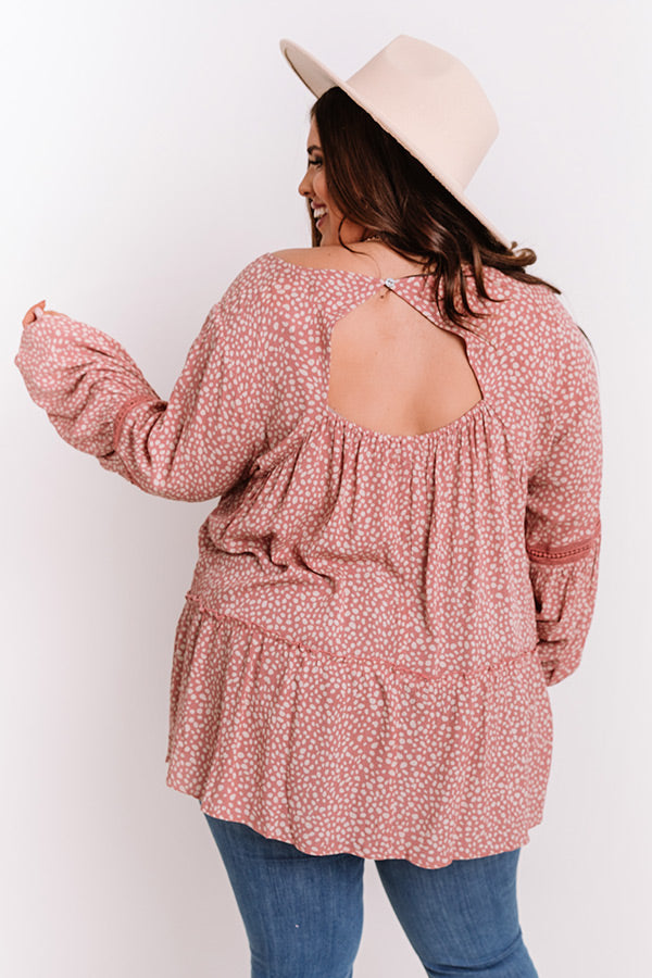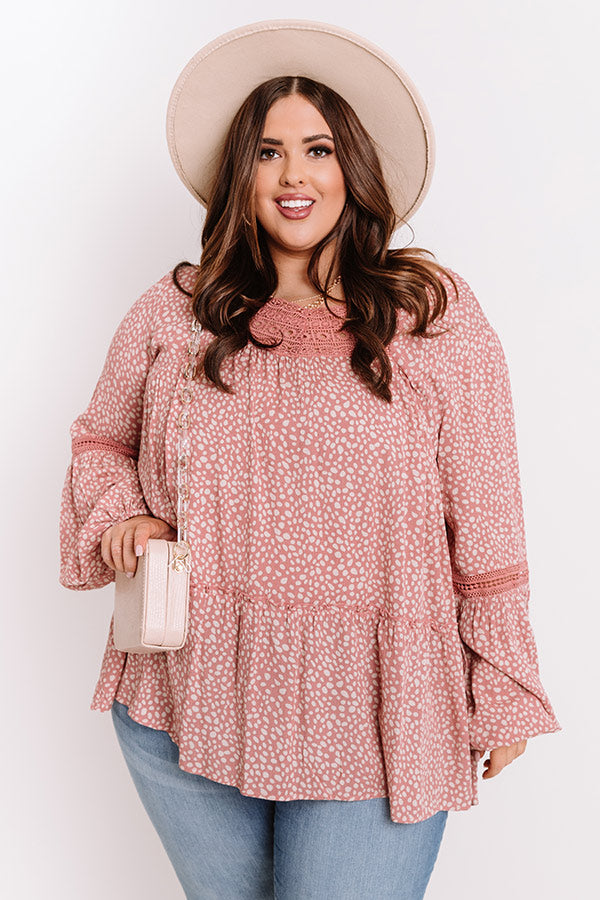Plus Size - You are sure to have heart eyes for our charming blush colored 'Sweet Poetry Shift Top' featuring lightweight flowy material patterned with a small white spotted print, a scooped neckline with intricate crochet detailing, long loose sleeves with elastic band cuffs, a cutout open back with a button closure, and an ultra relaxed silhouette that falls into a rounded hemline!