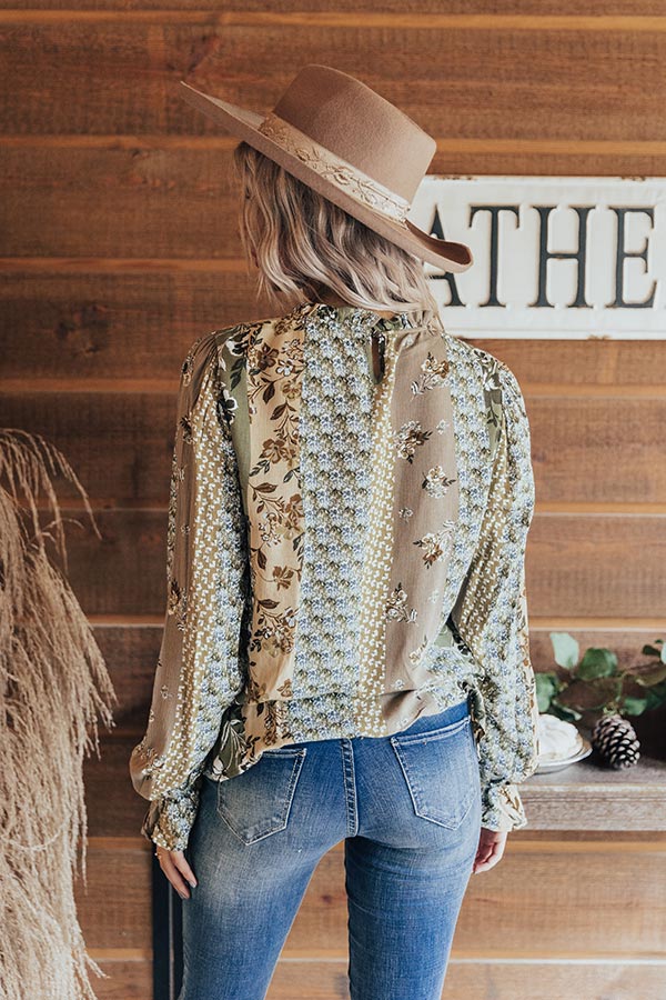 You are sure to gain a stylish reputation when you arrive in this sweet shift top featuring lightweight material, natural and green hued color block panels patterned with a variety of intricate floral prints, a rounded neckline, long bishop sleeves with flared cuffs, a keyhole accented upper back with a button closure, and a relaxed silhouette that falls into a straight hemline!