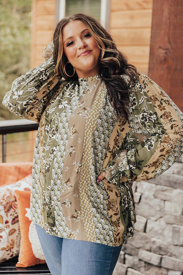 You are sure to gain a stylish reputation when you arrive in this sweet plus size shift top featuring lightweight material, natural and green hued color block panels patterned with a variety of intricate floral prints, a rounded neckline, long bishop sleeves with flared cuffs, a keyhole accented upper back with a button closure, and a relaxed silhouette that falls into a straight hemline! Measurements