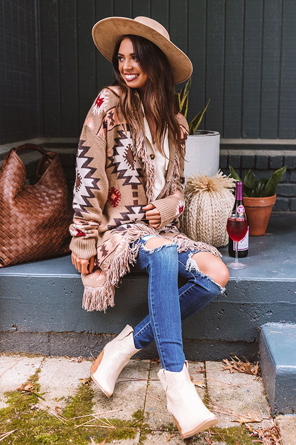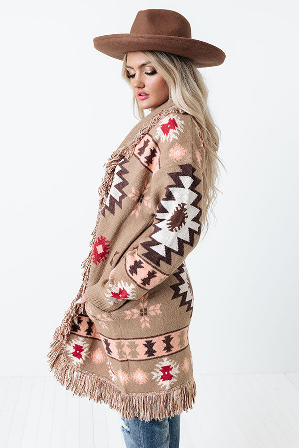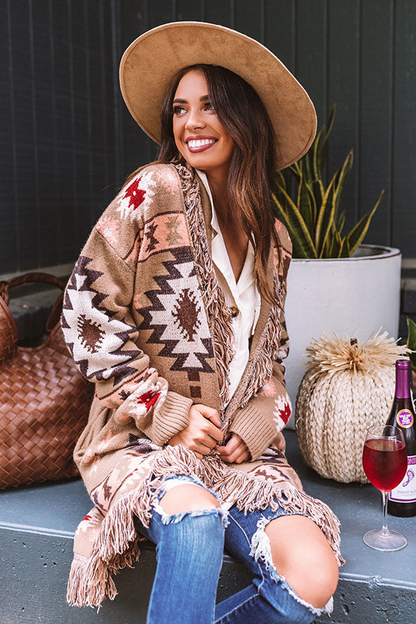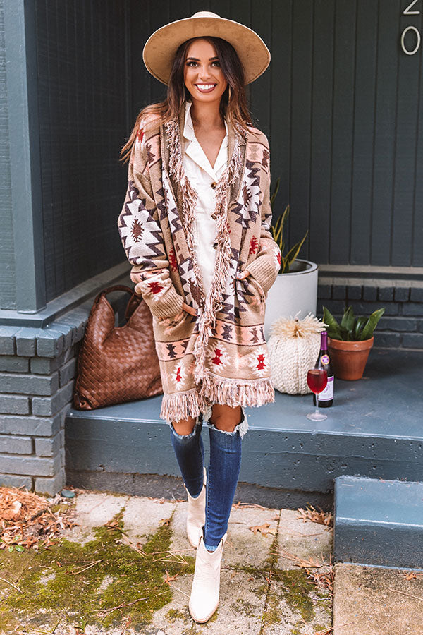 Keep warm during those colder months with our gorgeous mocha colored 'Sweet Retreat' cardigan featuring ultra soft and thick tight knit material patterned with a bold brown, neutral, red, and cream hued aztec pattern, long loose sleeves with ribbed cuffs, oversexed fringe trim detailing, accent side pockets, and a draped open front silhouette that falls into a straight mid-thigh length hemline!
