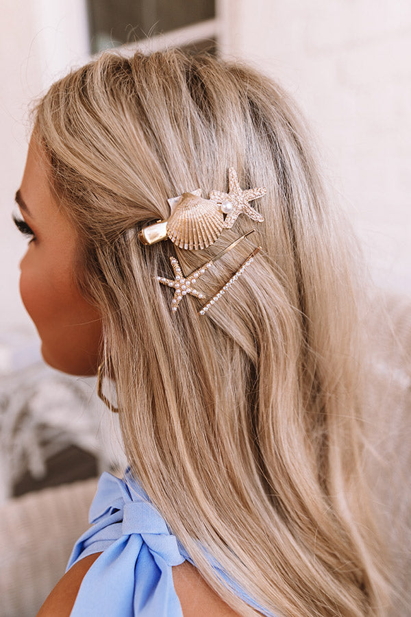 Stay focused and sparkly by accessorizing with our adorable gold "Sweet Shores Hair Clip Set" featuring a rhinestone starfish and large seashell, a pearl bobby pin, and another glitzy starfish bobby pin!