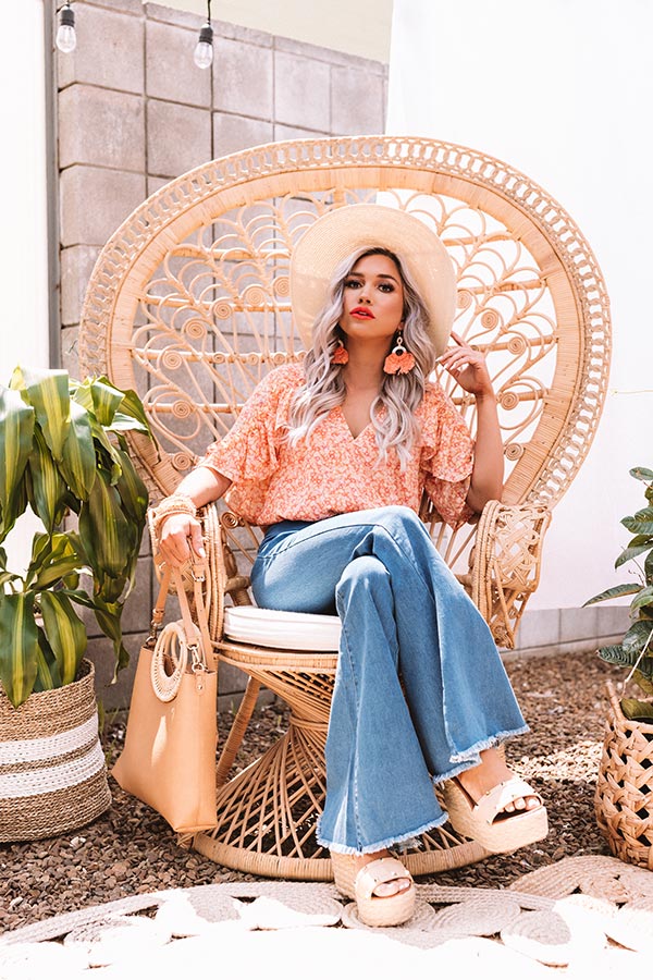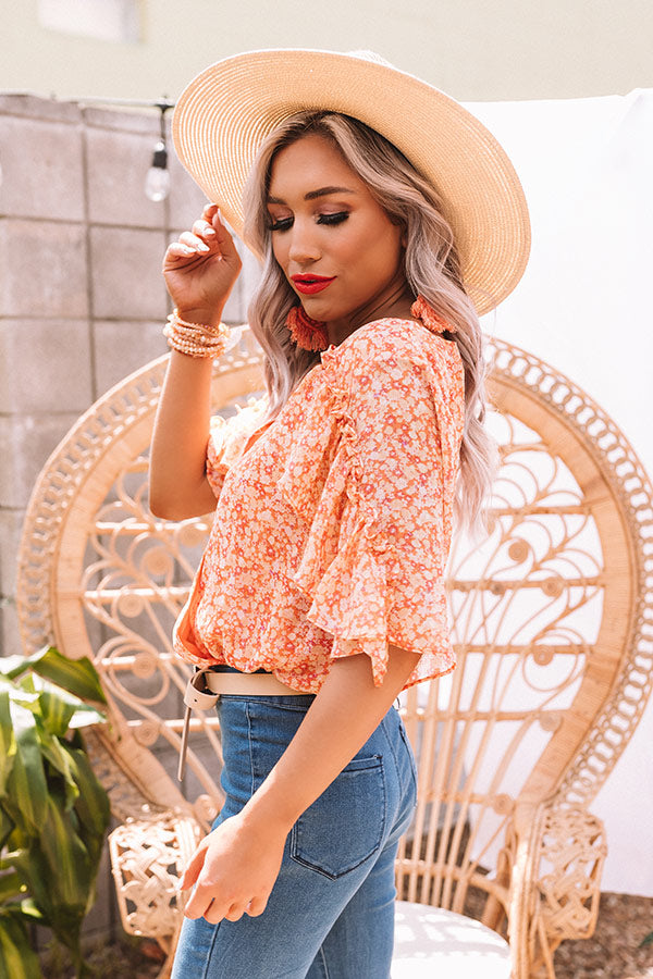 Send off those hot summer days in style with this sweet orange hued bodysuit featuring lightweight material patterned with a small floral print, a wrap bodice with a deep v-cut neckline, loose half sleeves with ruffled detailing, and a relaxed silhouette that falls into cheeky fit bottoms with a snap closure! You can style this versatile piece under any type of bottoms and wear any type of outerwear with it for a variety of looks that will carry you from season to season! Measurements