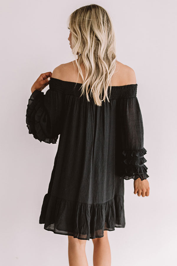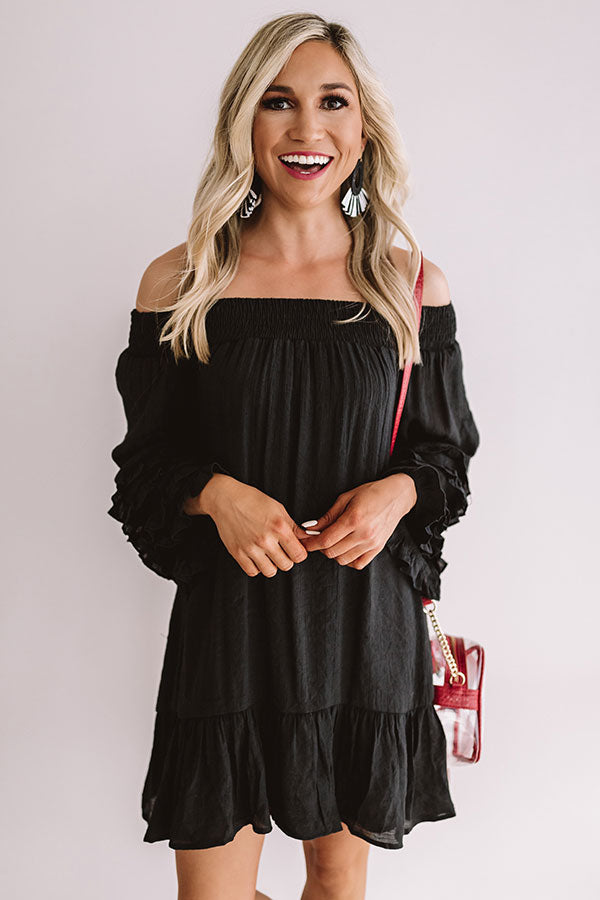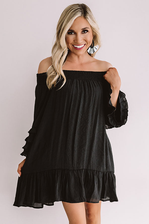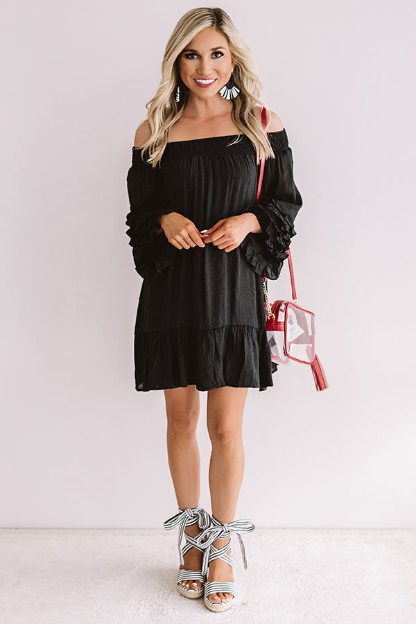 You will be sweet tea sippin' and sunshine drippin' in this black shift dress featuring flared ruffle sleeves, a smocked off-shoulder fit, and flowy bodice that ends in an oversized hem! Plus, it has a sewn in slip! This adorable piece can be styled with striped wrap wedges and a red transparent bag for an adorable summer event look or with our "Layla Heel in Black" and the "Leopard Forever Purse" for a chic summer date look! Measurements
