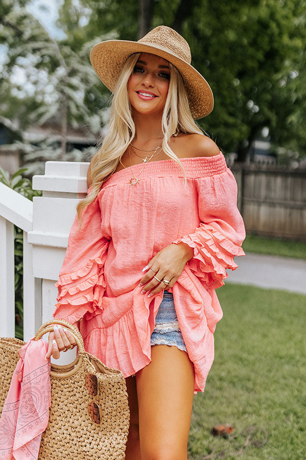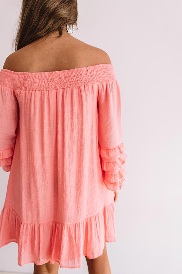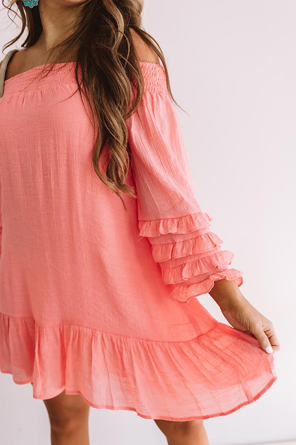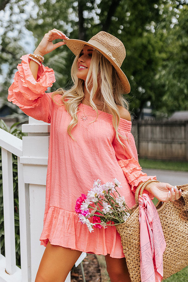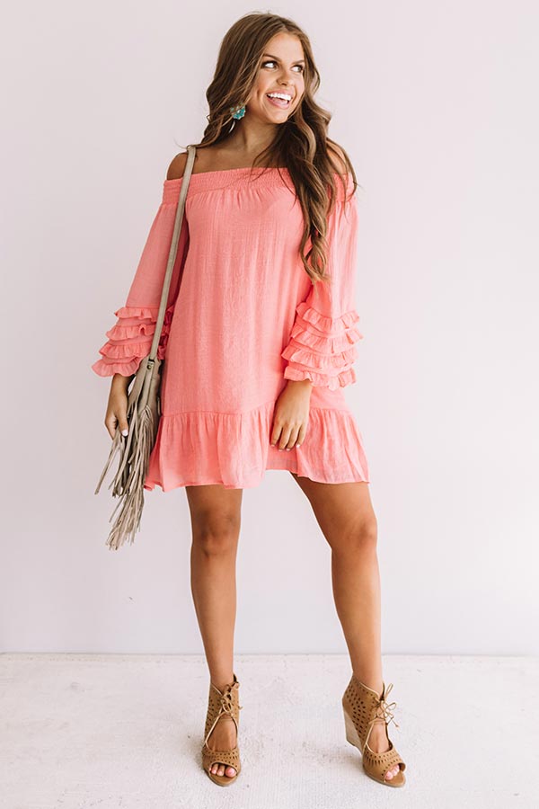 You will be sweet tea sippin' and sunshine drippin' in this coral shift dress featuring flared ruffle sleeves, a smocked off-shoulder fit, and flowy bodice that ends in an oversized hem! Plus, it has a sewn in slip!