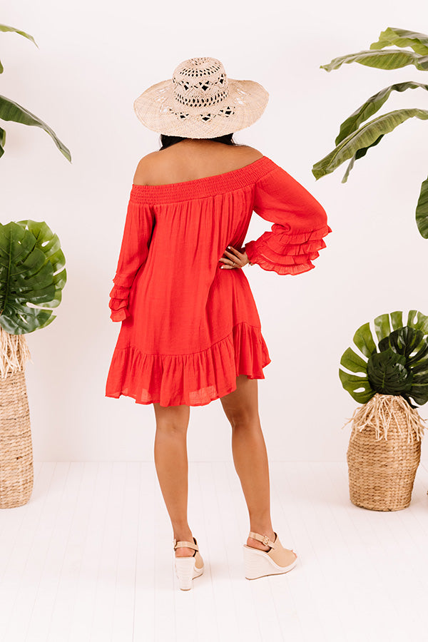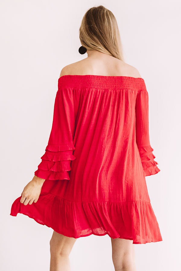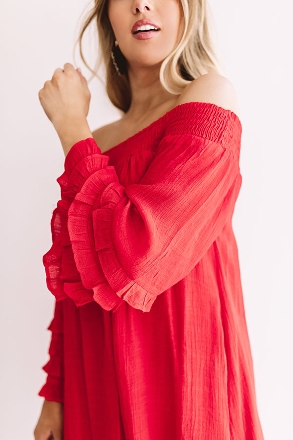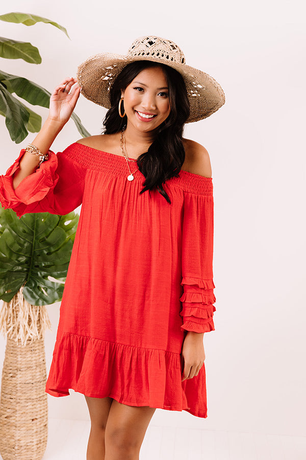 You will be sweet tea sippin' and sunshine drippin' in this red hot shift dress featuring flared ruffle sleeves, an off-shoulder fit with a straight elastic neckline, and flowy silhouette that ends in a mid-thigh length uneven hemline! Plus, it has a sewn in slip!