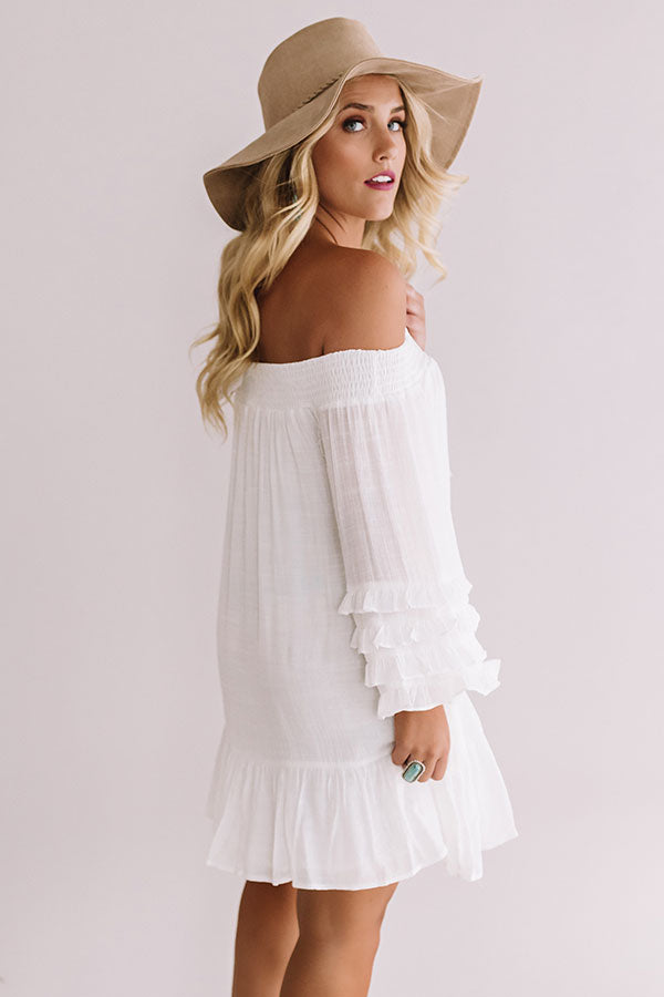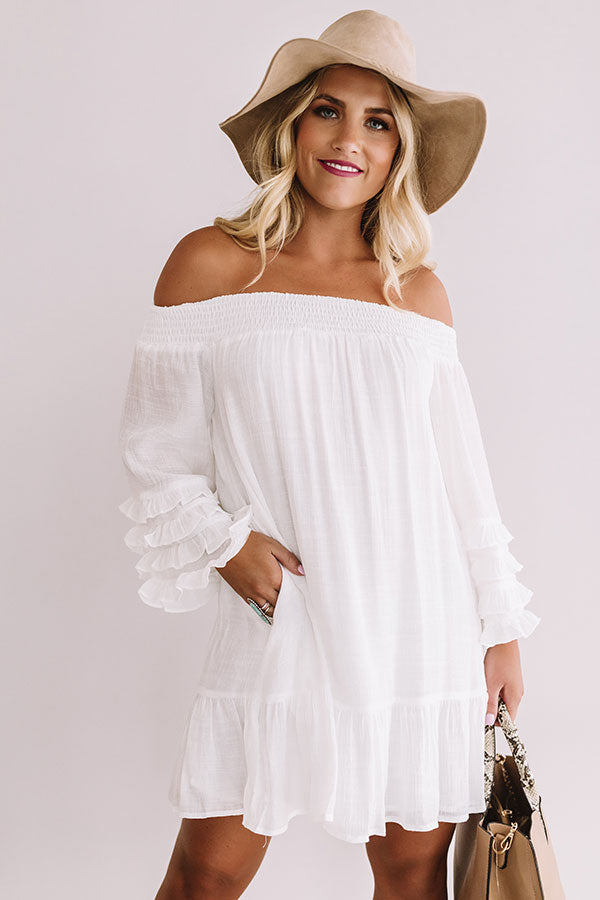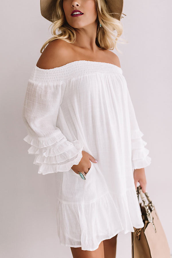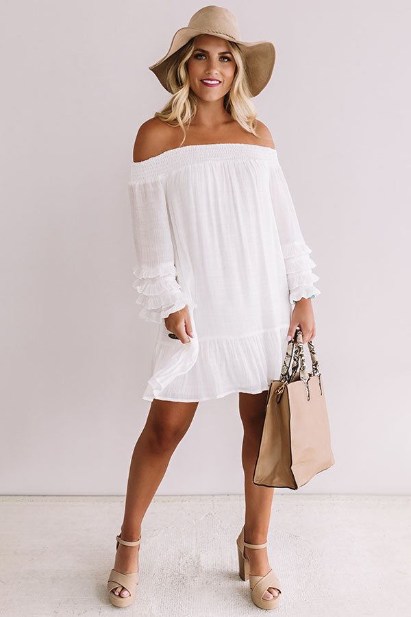 You will be sweet tea sippin' and sunshine drippin' in this white shift dress featuring flared ruffle sleeves, a smocked off-shoulder fit, and flowy bodice that ends in an oversized hem! Plus, it has a sewn in slip! This adorable piece can be styled with a neutral platform heel, tote bag, and faux suede hat for an adorable summer event look or with our "Nicolette Faux Suede Espadrille Wedge in Hot Pink" and the "Shimmer In Style Rhinestone Clutch in Silver" for a chic summer date look! Measurements
