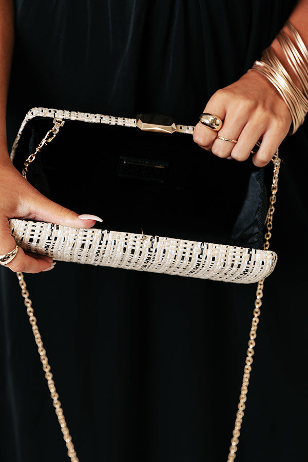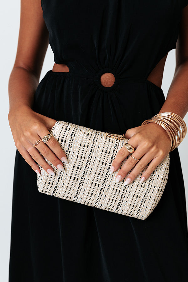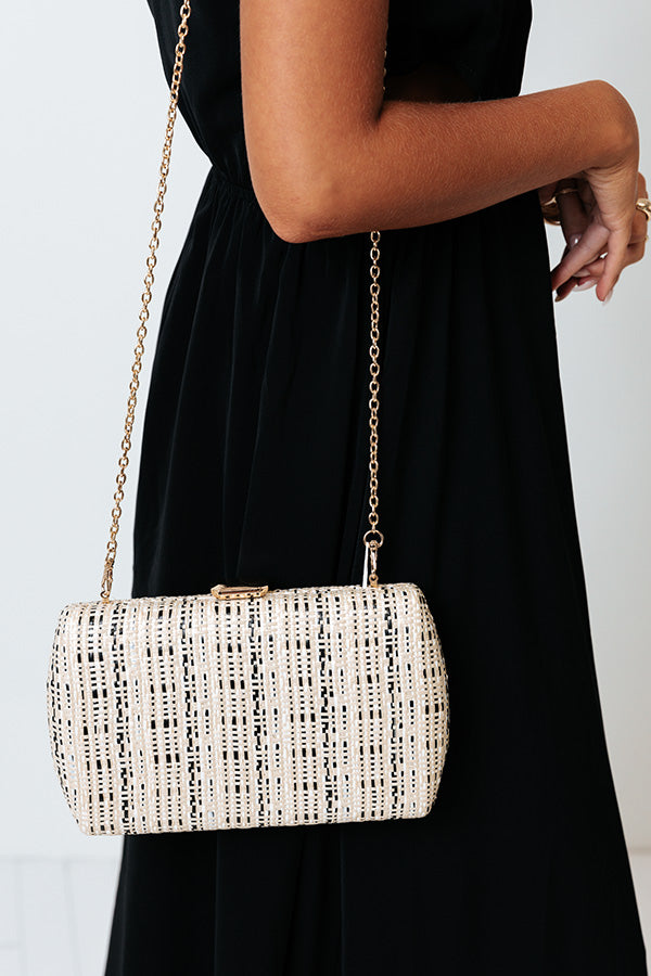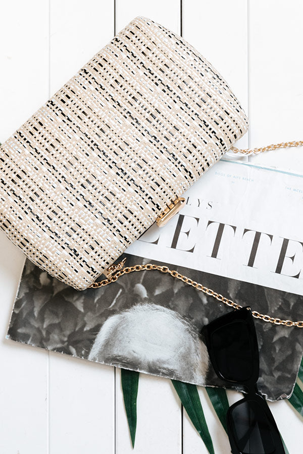 Add a simple summer touch to your look with our adorable 'Sweet Sound' clutch featuring black and cream hued material with woven stripe texturing, a snap closure, and a structured rectangular silhouette!