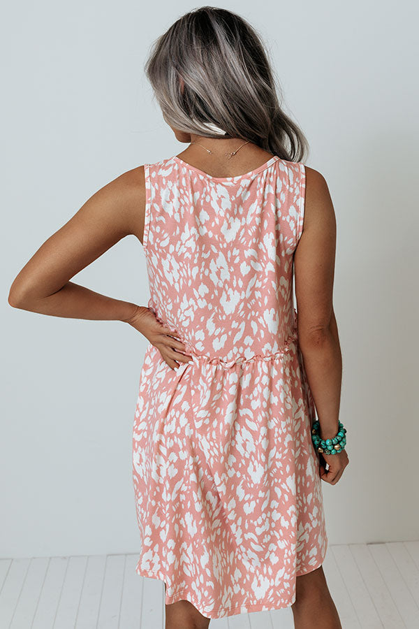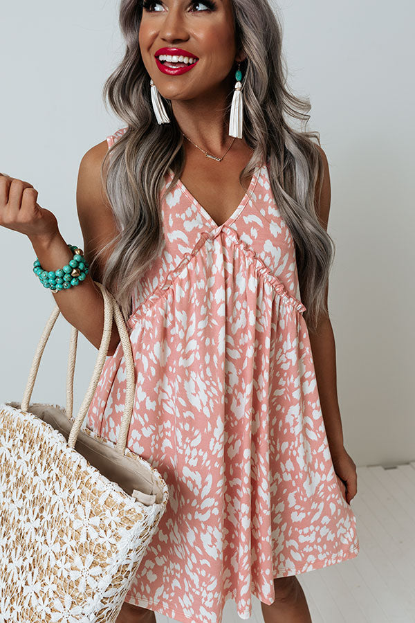Sweeten up your wardrobe with this adorable pink shift dress featuring lightweight flowy material patterned with a white leopard print, a v-cut neckline, wide sleeveless shoulder straps, and a relaxed silhouette that falls into a straight mid-thigh length hemline! Measurements