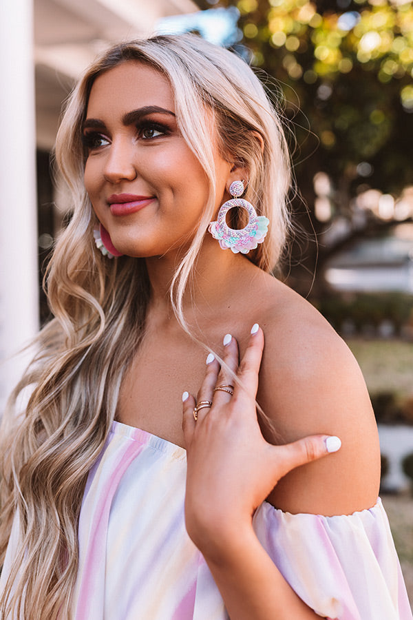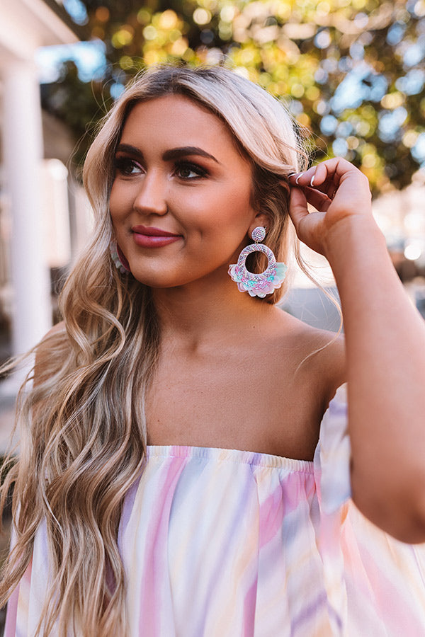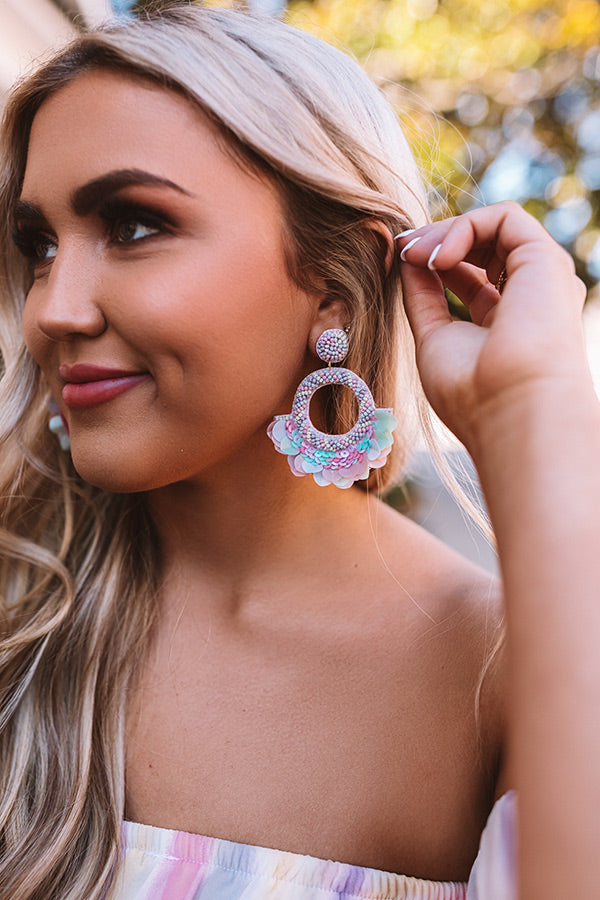 Add a sweet taste of spring to your OOTD by accessorizing with these adorable statement earring featuring lavender and light blue beaded studs and dangling lavender and light blue beaded hoops with sequin fan accents!