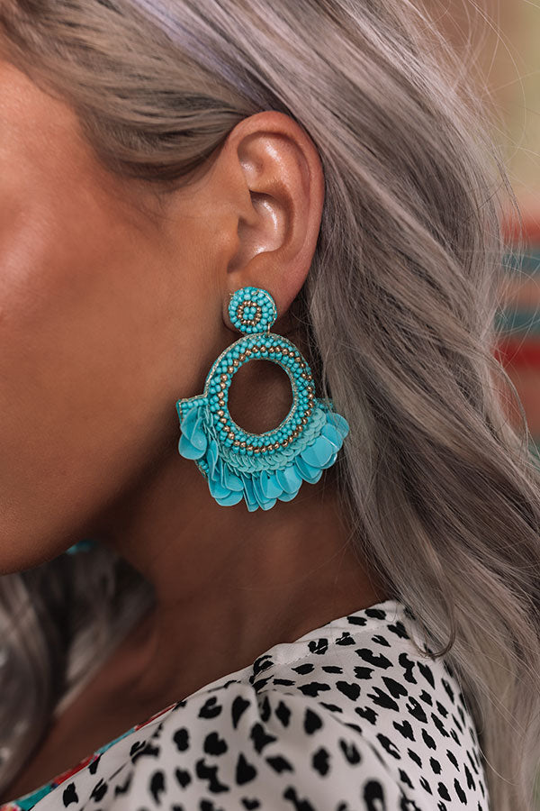 Add a sweet taste of spring to your OOTD by accessorizing with these adorable turquoise statement earring featuring beaded studs and dangling beaded hoops with sequin fan accents!