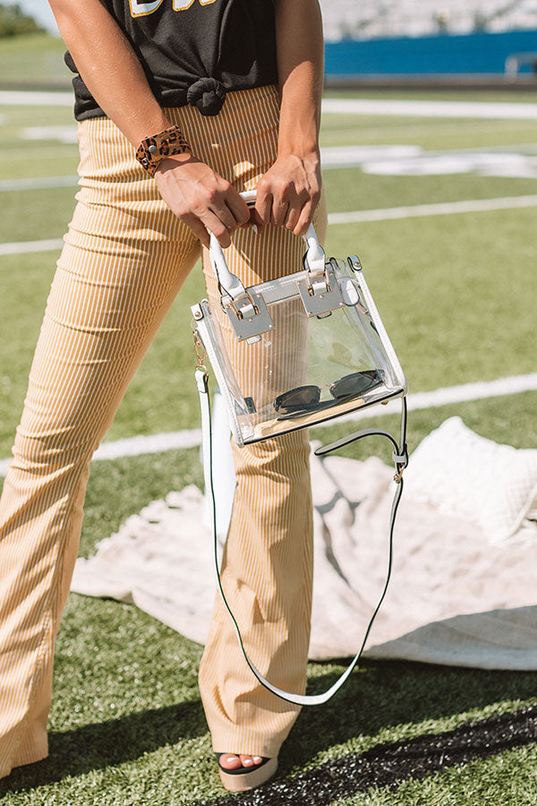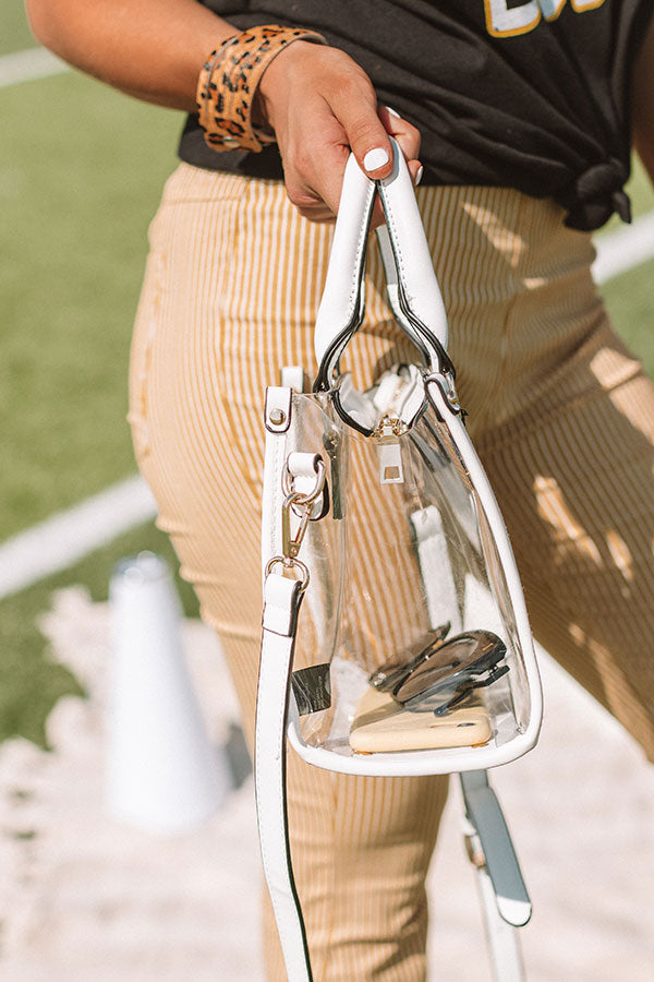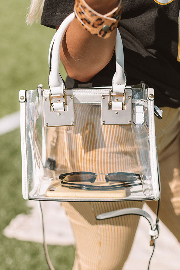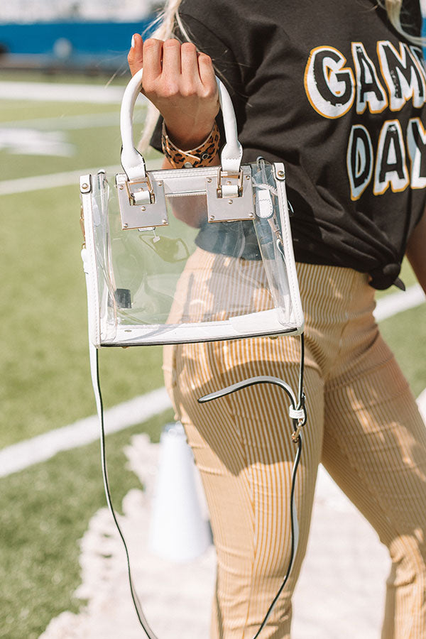 When you carry this transparent purse, the football game won't be the only thing winning a "sweet victory," your style game will too! It features two tote handles, a zippered square pouch, white trim with gold accents, and an adjustable shoulder strap!