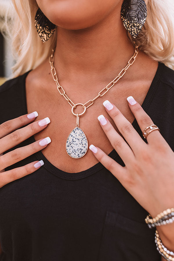 Add a whimsy tough to your OOTD by accessorizing with this sweet necklace featuring a gold large link chain with a taupe colored teardrop pendant with spotted detailing!