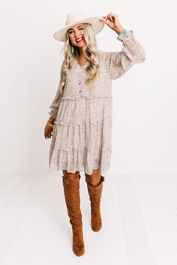 Sweeten up you wardrobe with this charming birch colored shift dress featuring lightweight and flowy material patterned with a small white spotted print, a button up bodice with a v-cut neckline, long loose bishop sleeves with flared elastic band cuffs, ruffled exposed accent seams, and a relaxed tiered silhouette that cascades into an uneven mid-thigh length hemline!