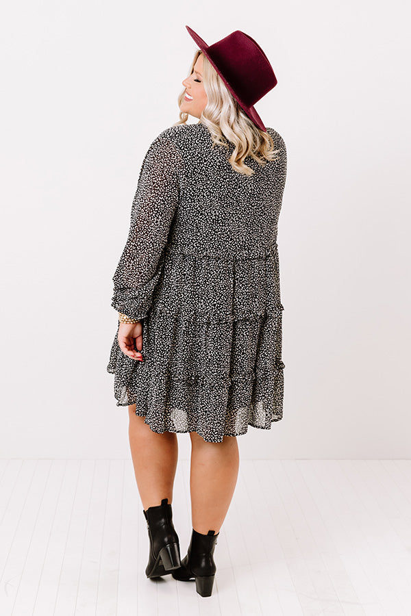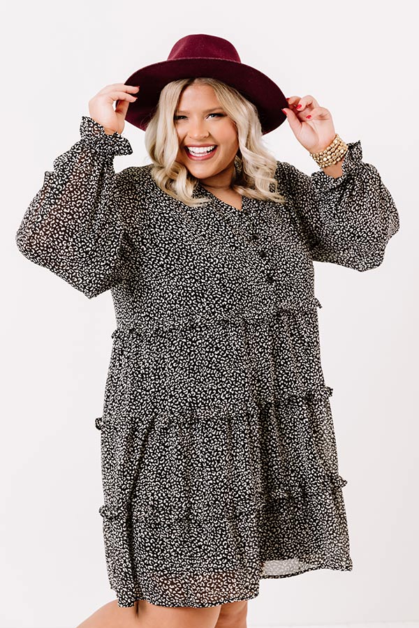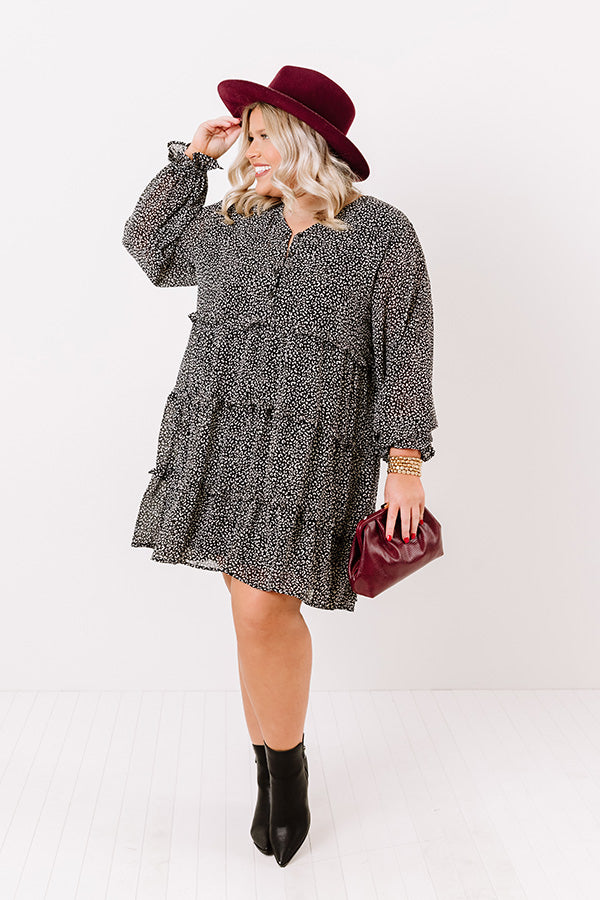 Plus Size - Sweeten up you wardrobe with this charming black shift dress featuring lightweight and flowy material patterned with a small white spotted print, a button up bodice with a v-cut neckline, long loose bishop sleeves with flared elastic band cuffs, ruffled exposed accent seams, and a relaxed tiered silhouette that cascades into an uneven mid-thigh length hemline! Measurements