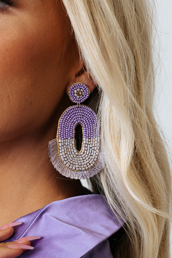 Sweeten up your look with these stunning statement earrings featuring lavender beaded circle studs and oversized dangling lavender oval hoops with lighter lavender tassel fan detailing!