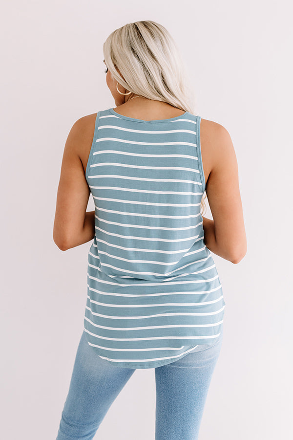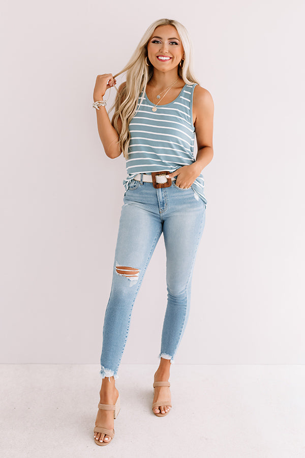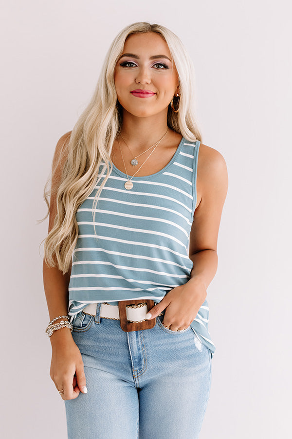 Everyone knows you look "sweeter in stripes," so don't hesitate to add this casual cute airy blue shift tank to your cart! It features soft lightweight material with horizontal white accent stripes, a scooped neckline, 1-inch sleeveless shoulder straps, and a relaxed silhouette that falls into a rounded tunic-length hemline! This upscale basic styles perfectly with some distressed light wash skinnies, a statement belt, and neutral mule heels, but you can also wear it with some frayed white shorts, "The Brighton Espadrille in Airy Blue," our "Blissful Bay Woven Tote," and our "Laying Out In Laguna Woven Hat!" Measurements
