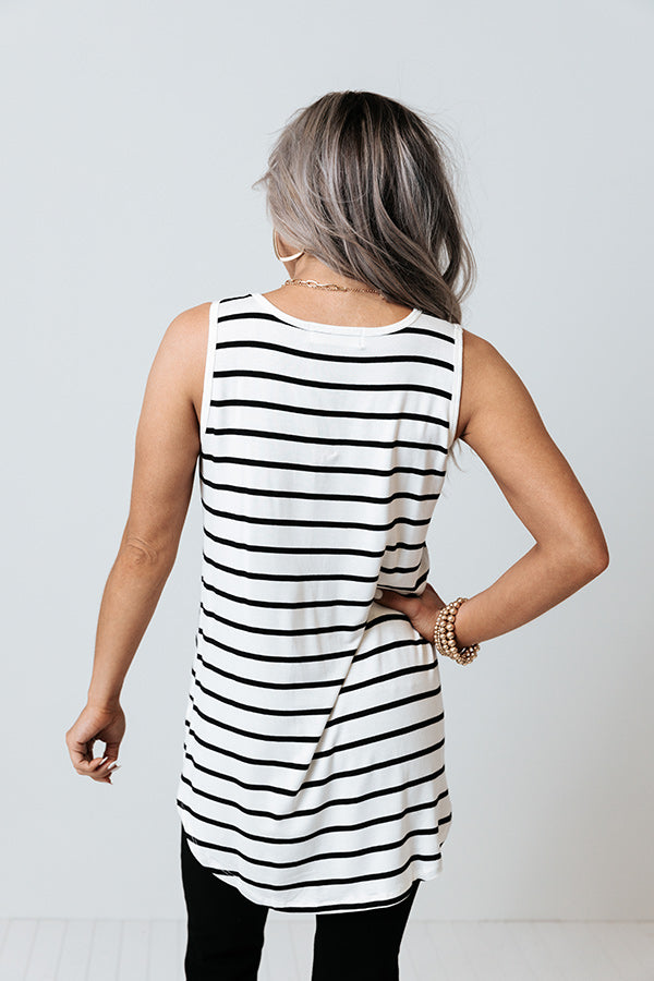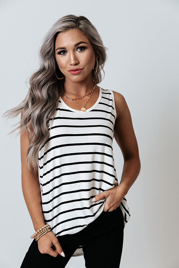 Everyone knows you look 'sweeter in stripes, so don't hesitate to add this casual cute white shift tank to your cart! It features soft lightweight material with horizontal black accent stripes, a scooped neckline, 1-inch sleeveless shoulder straps, and a relaxed silhouette that falls into a rounded tunic-length hemline! Measurements