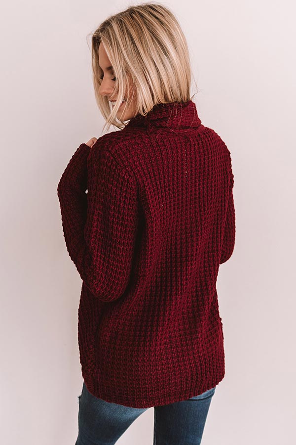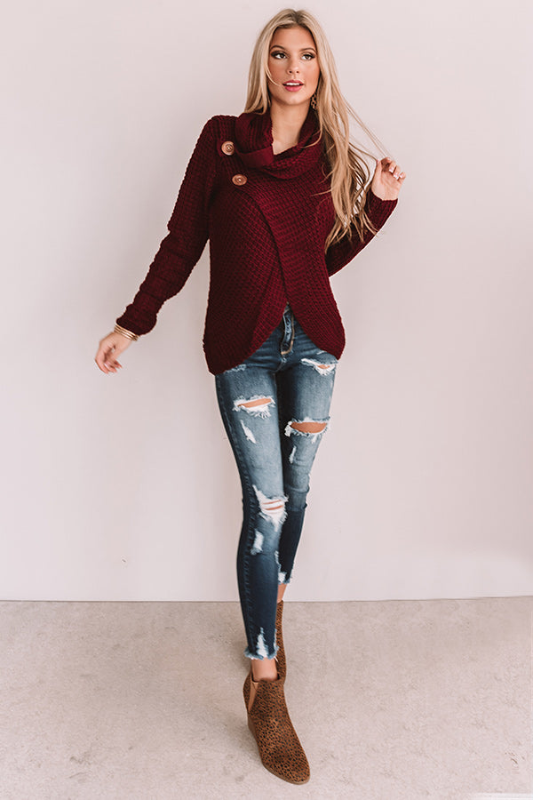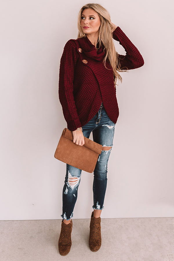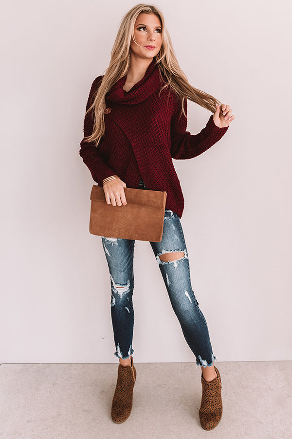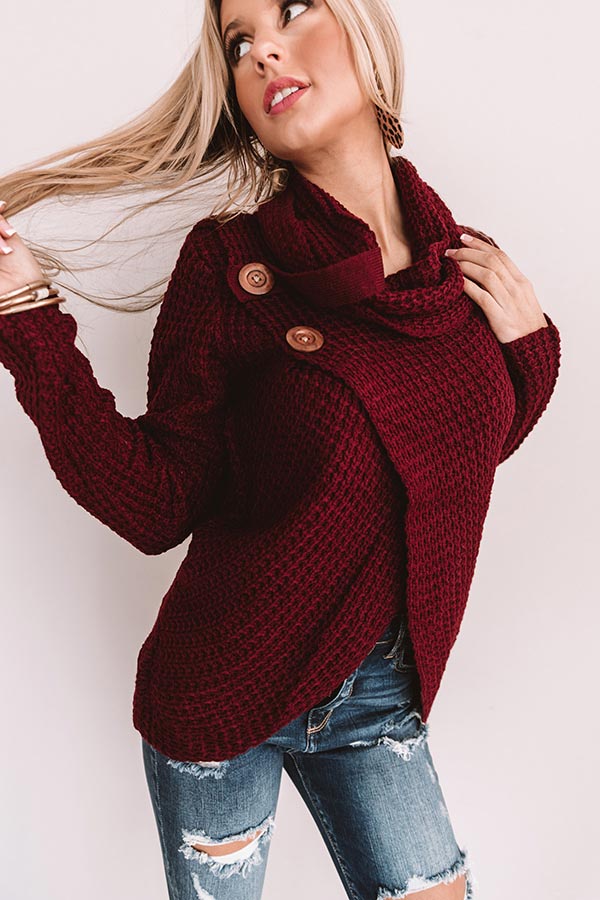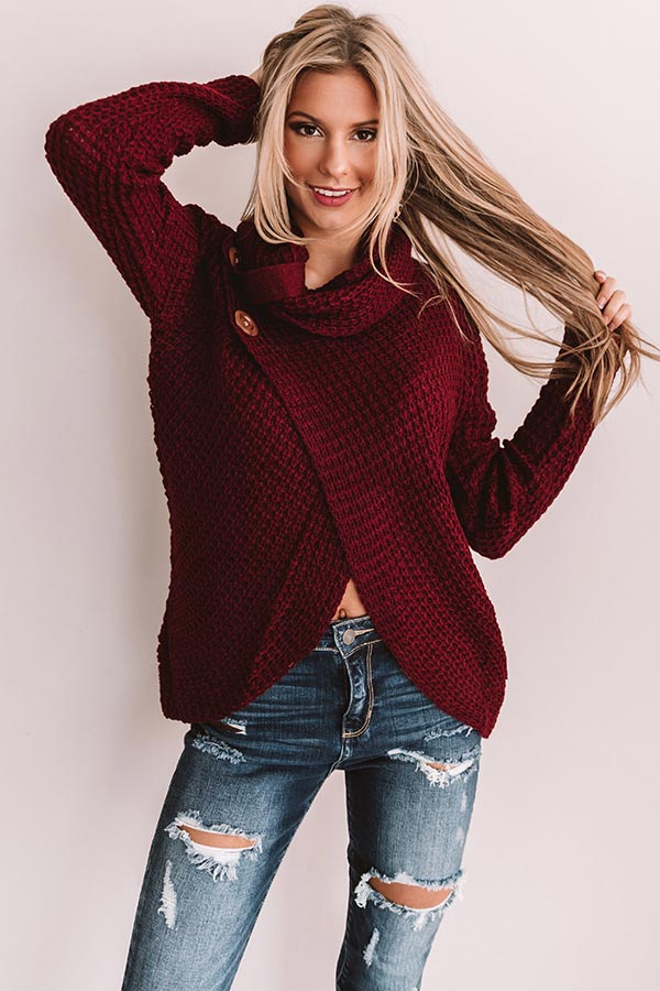 This adorable maroon colored sweater is "sweeter than cider" with its soft lightweight tight knit material with large ribbed texturing, a draped turtle neckline, long semi-loose sleeves, a wrapped bodice with a two button closure on the chest, and a relaxed silhouette that falls into a rounded hemline! We have styled this cold weather cutie with some distressed ankle skinnies, and a neutral bootie and clutch, but you can also wear it with our "Positive Vibes Faux Suede Skort in Taupe," "The Seraphina Faux Leather Wedge in Brown," and our "Vintage Vibes Felt Hat in Tan!" Measurements