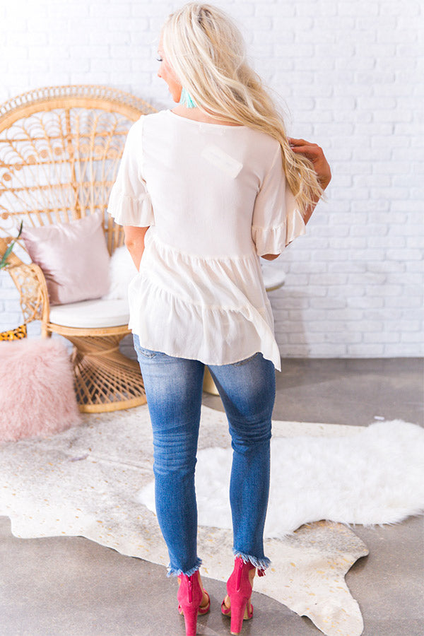 Look "sweet as sugar" in this versatile must-have! This stylishly simple sweetie has a round neckline, short ruffled sleeves & an ultra girly babydoll bodice. Dress this babe up with skinny jeans & heels, or down with cut-off shorts & sandals for a variety of charming looks you're sure to fall in love with.