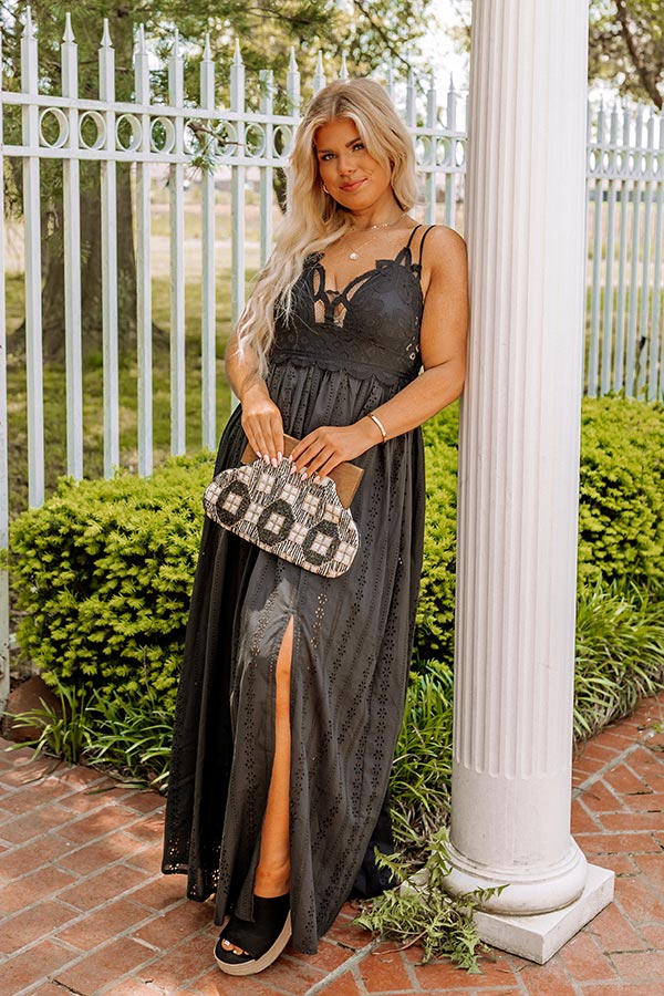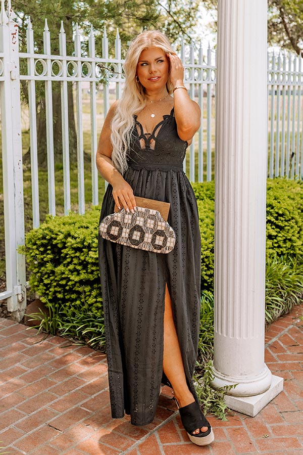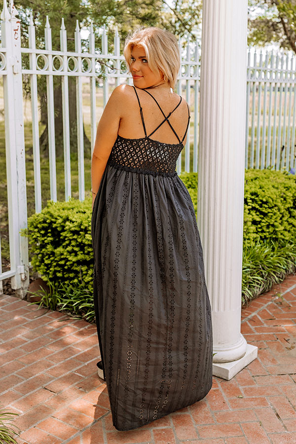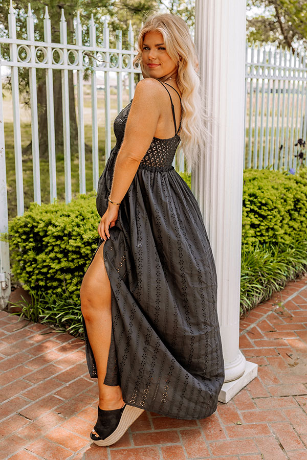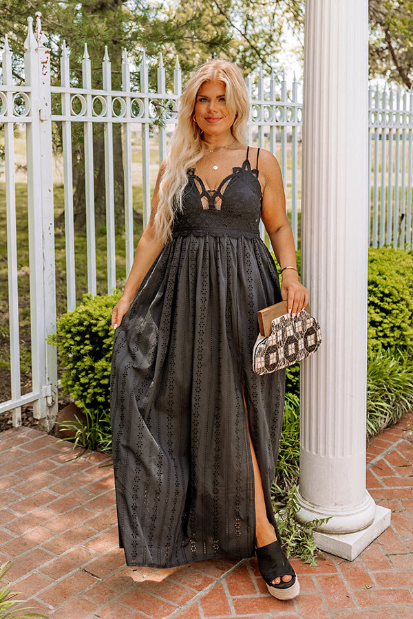 May all your sweetest dreams come true in this beautiful black plus size maxi dress featuring lightweight material with subtle texturing, an eyelet triangle bodice with a deep v-cut neckline, four adjustable spaghetti straps, and a relaxed skirt silhouette that cascades into a straight ankle-length hemline with an accent slit!