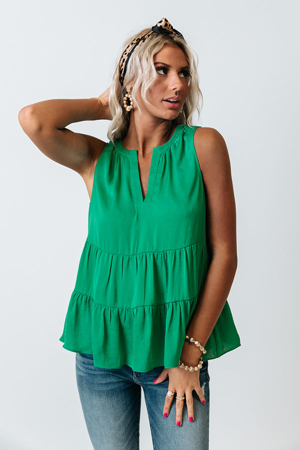 Complete your look effortlessly with our charming emerald hued 'Sweetest Love Shift Top' featuring lightweight flowy material, a rounded neckline with an accent v-cut notch, wide sleeveless shoulder straps, and a relaxed tiered silhouette that falls into a straight hemline! Measurements