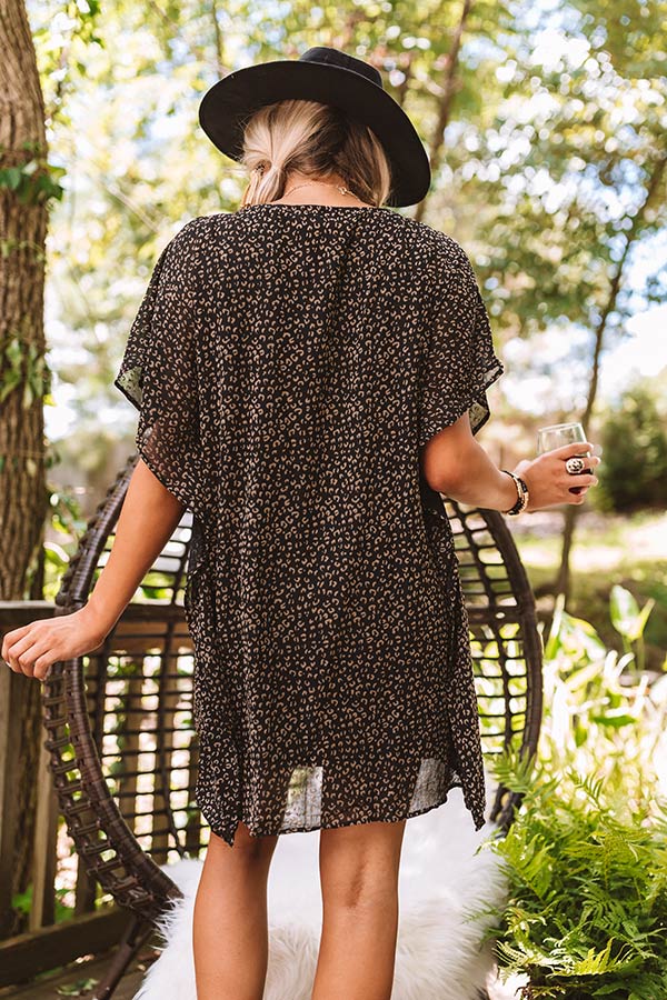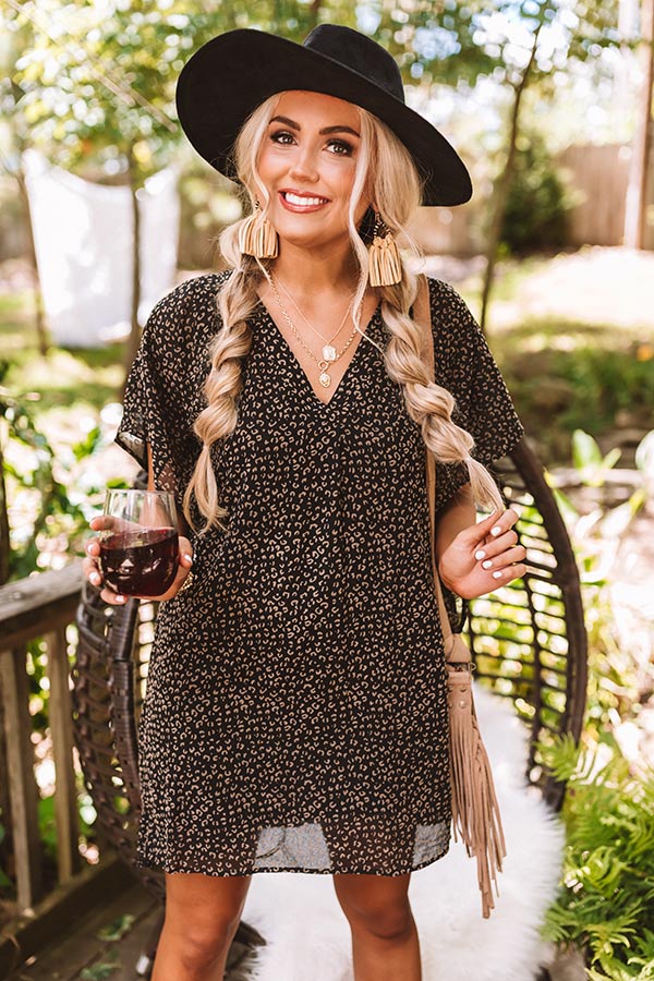 Take a walk on the wild side with our adorable black "Sweetest Soul" shift dress featuring lightweight breezy layered material patterned with a light neutral leopard print, a v-cut neckline, loose half bat wing sleeves with flap accents that continue down the sides, and an ultra relaxed silhouette that falls into a straight mid-thigh length hemline! We have styled this gorgeous piece with a matching wool hat and a brown bootie and fringe tote, but you can also wear it with our "Go On Faux Suede Heel in Black!"