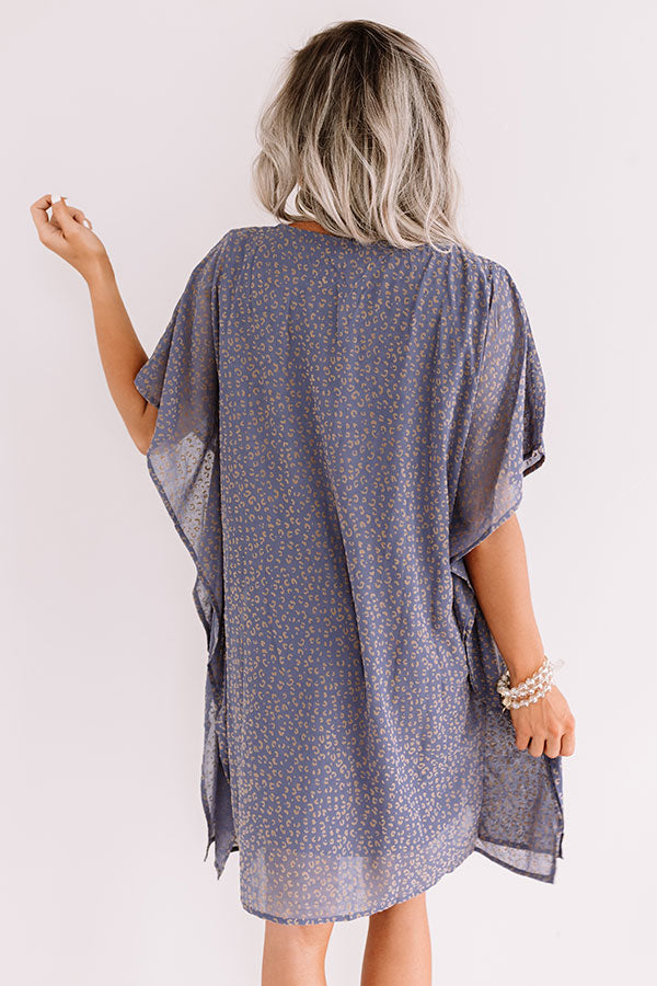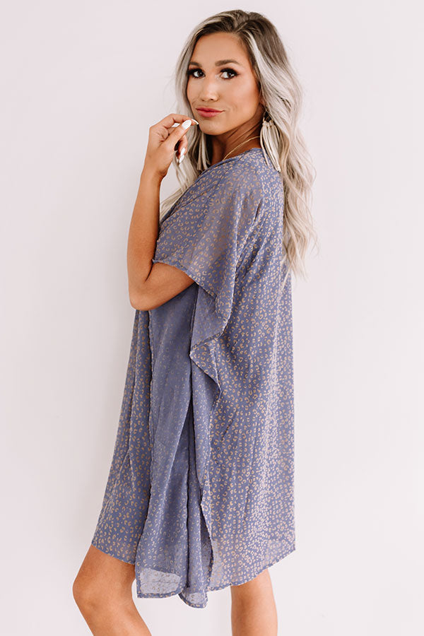 Take a walk on the wild side with our adorable dark periwinkle colored "Sweetest Soul" shift dress featuring lightweight breezy layered material patterned with a light neutral leopard print, a v-cut neckline, loose half bat wing sleeves with flap accents that continue down the sides, and an ultra relaxed silhouette that falls into a straight mid-thigh length hemline! Measurements