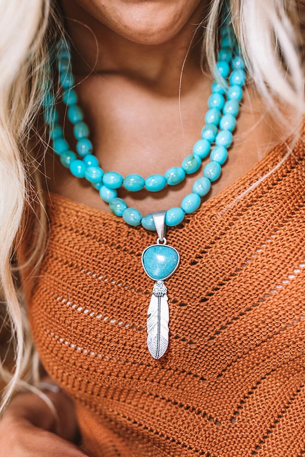 We have no doubt you will be "swept up" in how cute this gorgeous statement necklace is featuring two large turquoise beaded chains and a large turquoise pendant with an accent silver feather!