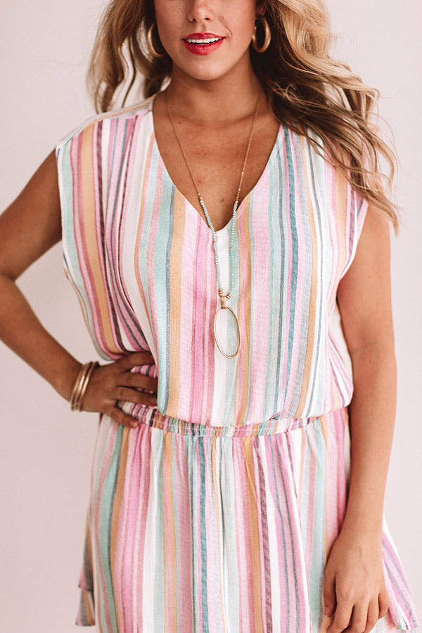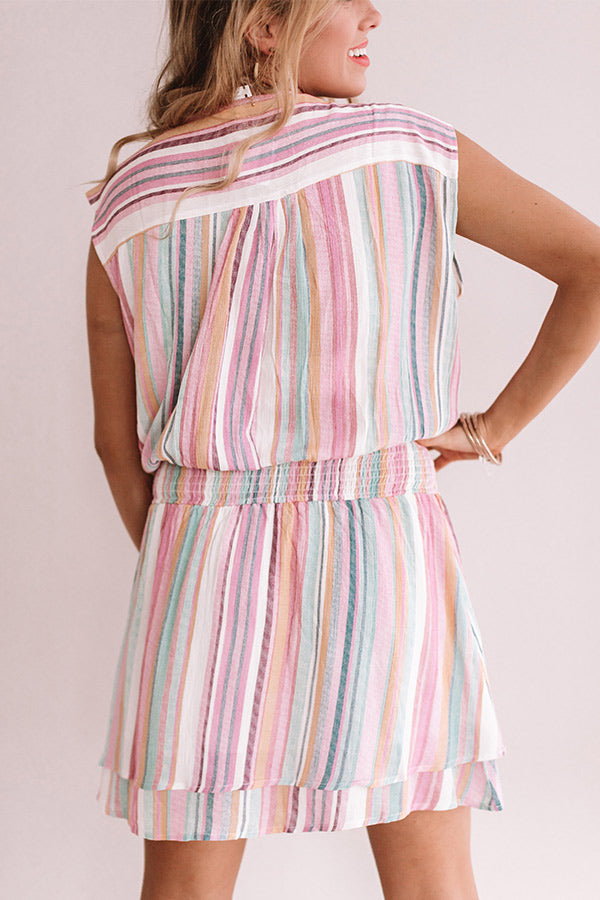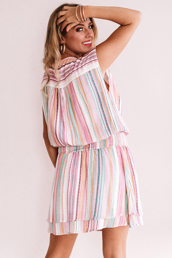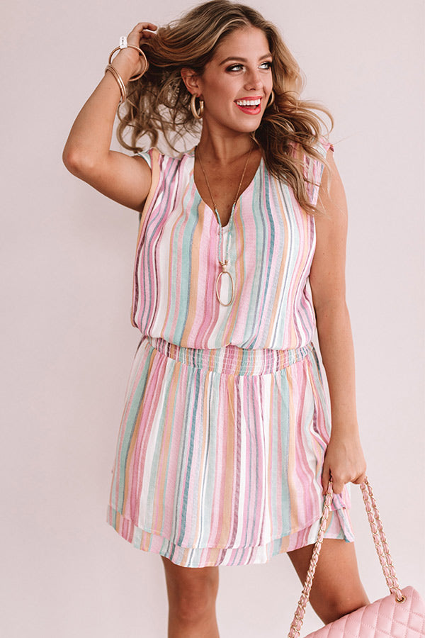 We have a serious love affair with stripes, so it should come as no surprise that this "Swirls And Kisses Stripe Dress" is our new favorite warm weather mini! This light pink piece features a v-neck, a thick smocked waistband, cap sleeves, and a relaxed silhouette with a mid-thigh length hemline that styles perfectly with neutral cutout wedges and a matching quilted crossbody or with white accessories like our "Tipton Espadrille" and "Sand And Shore Netted Bucket Bag!" Measurements